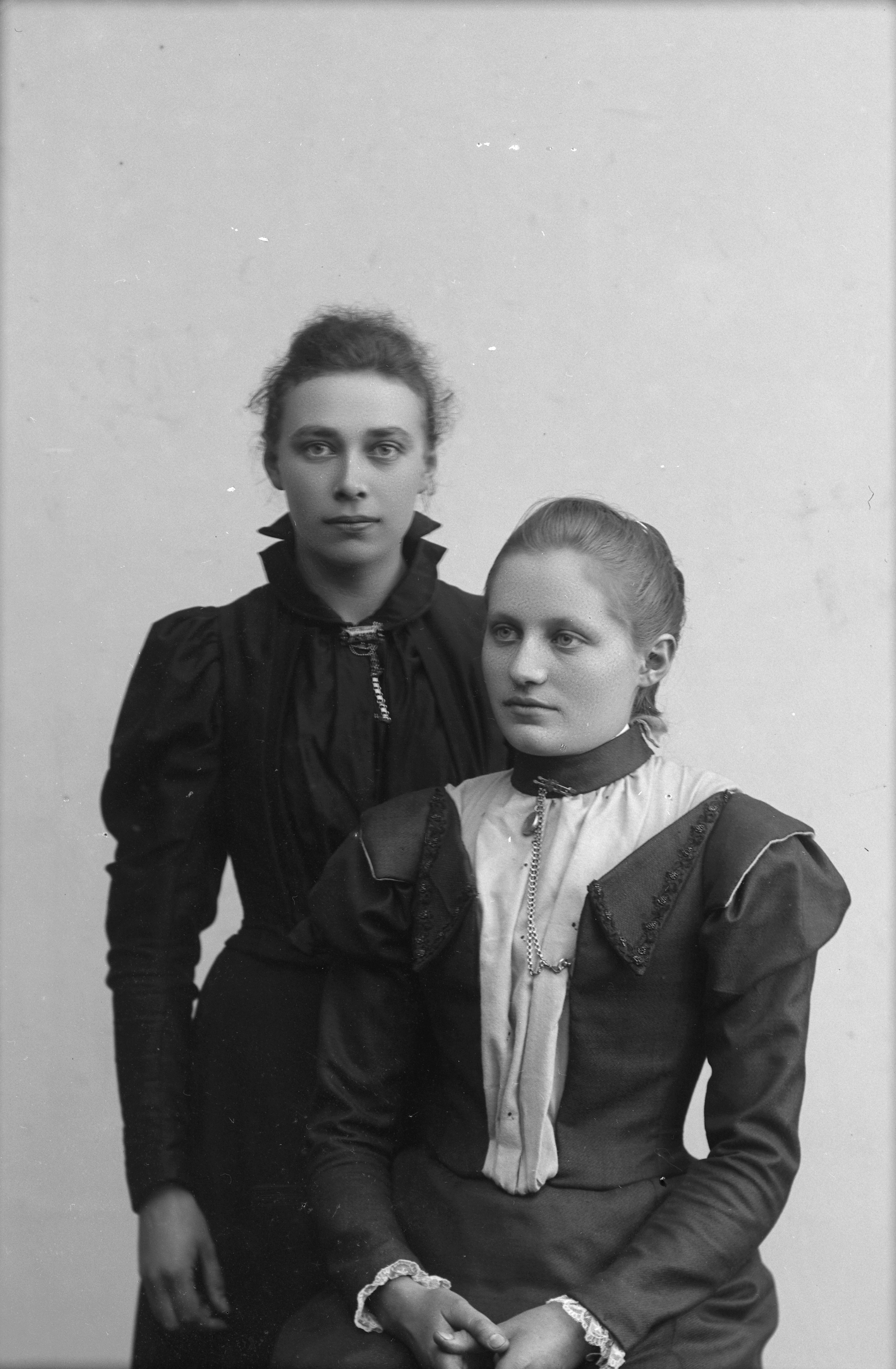 Porträtt i helfigur av Hilda Mårtensson med okänd kvinna, sittande och stående.