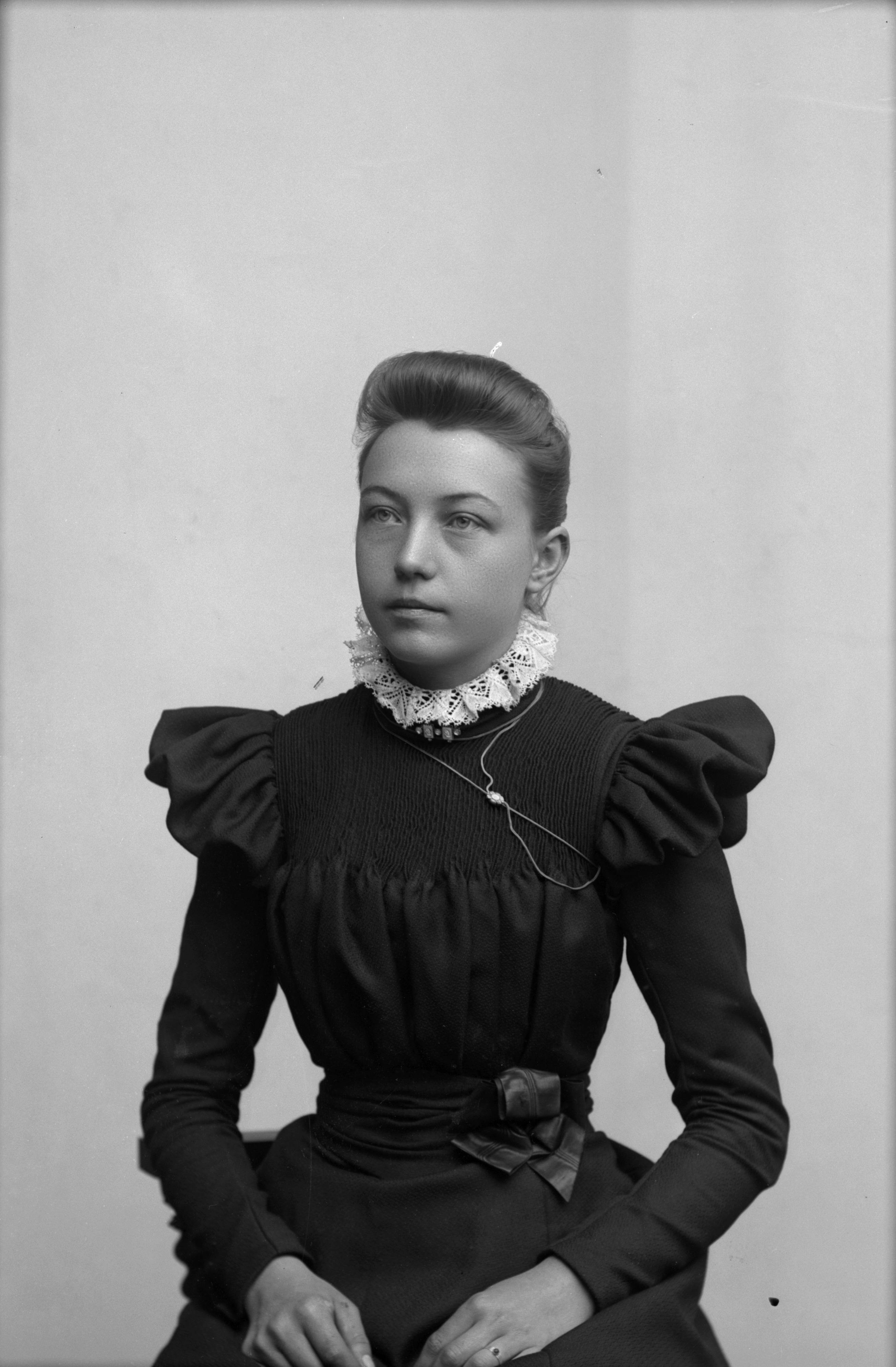 Beskrivning: Porträtt i halvfigur av Lina Svensson /Västergatan.