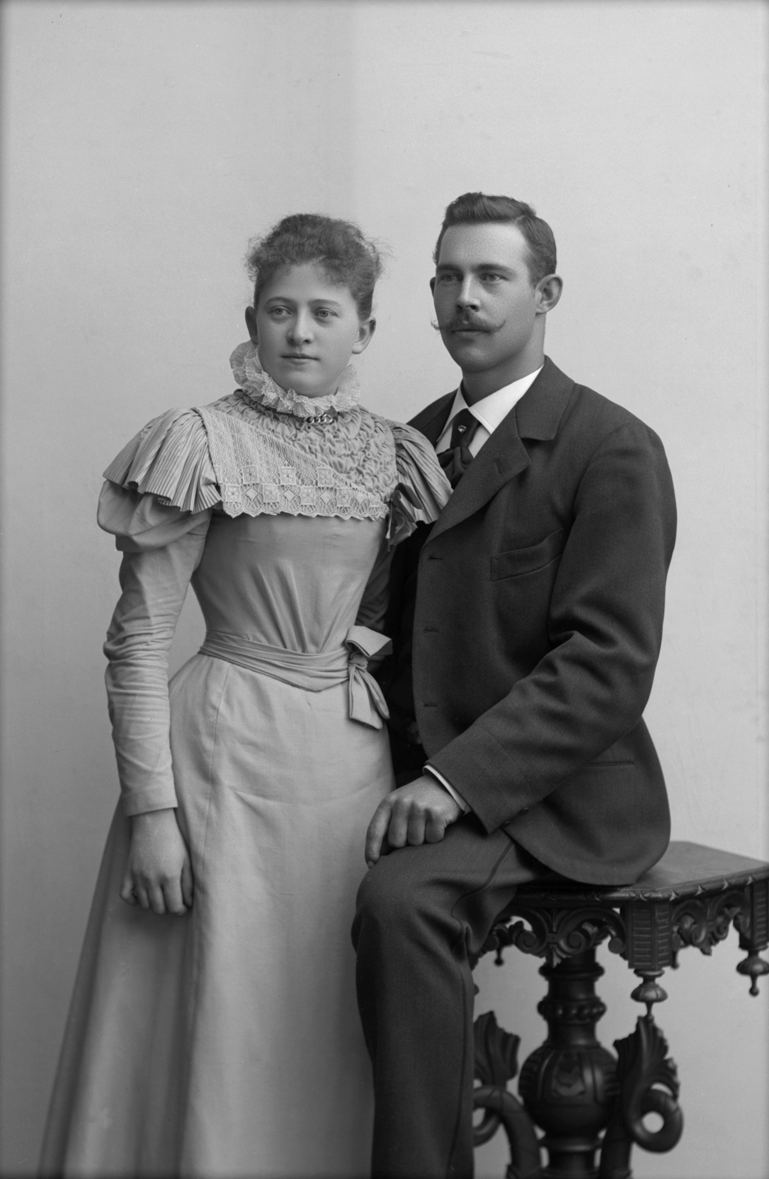 Beskrivning: Porträtt i helfigur av Bernhard J. Nordström med fru. Maken sittande på pelarbord.