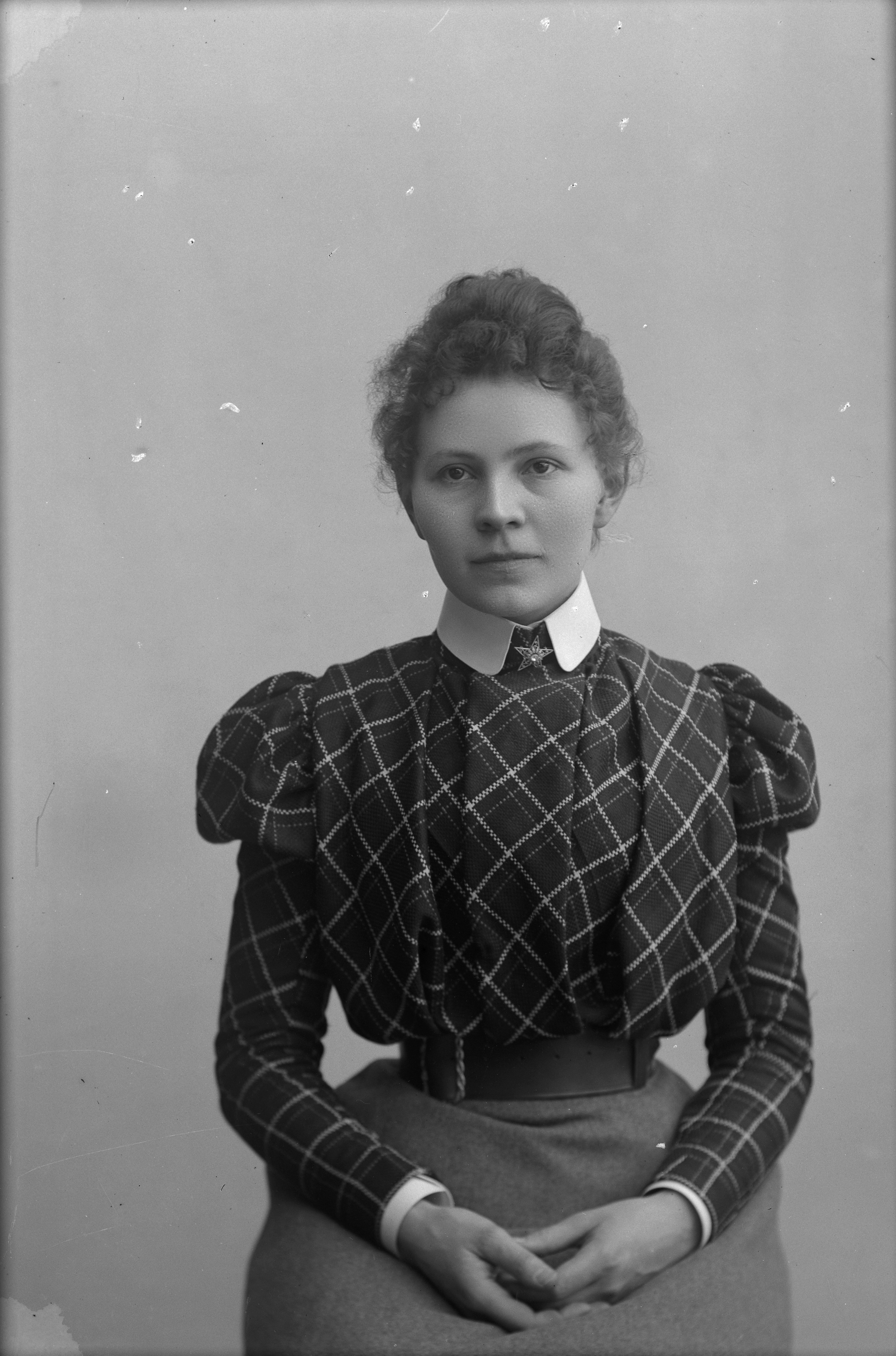Beskrivning: Porträtt i halvfigur av Mina Hammarstrand.
