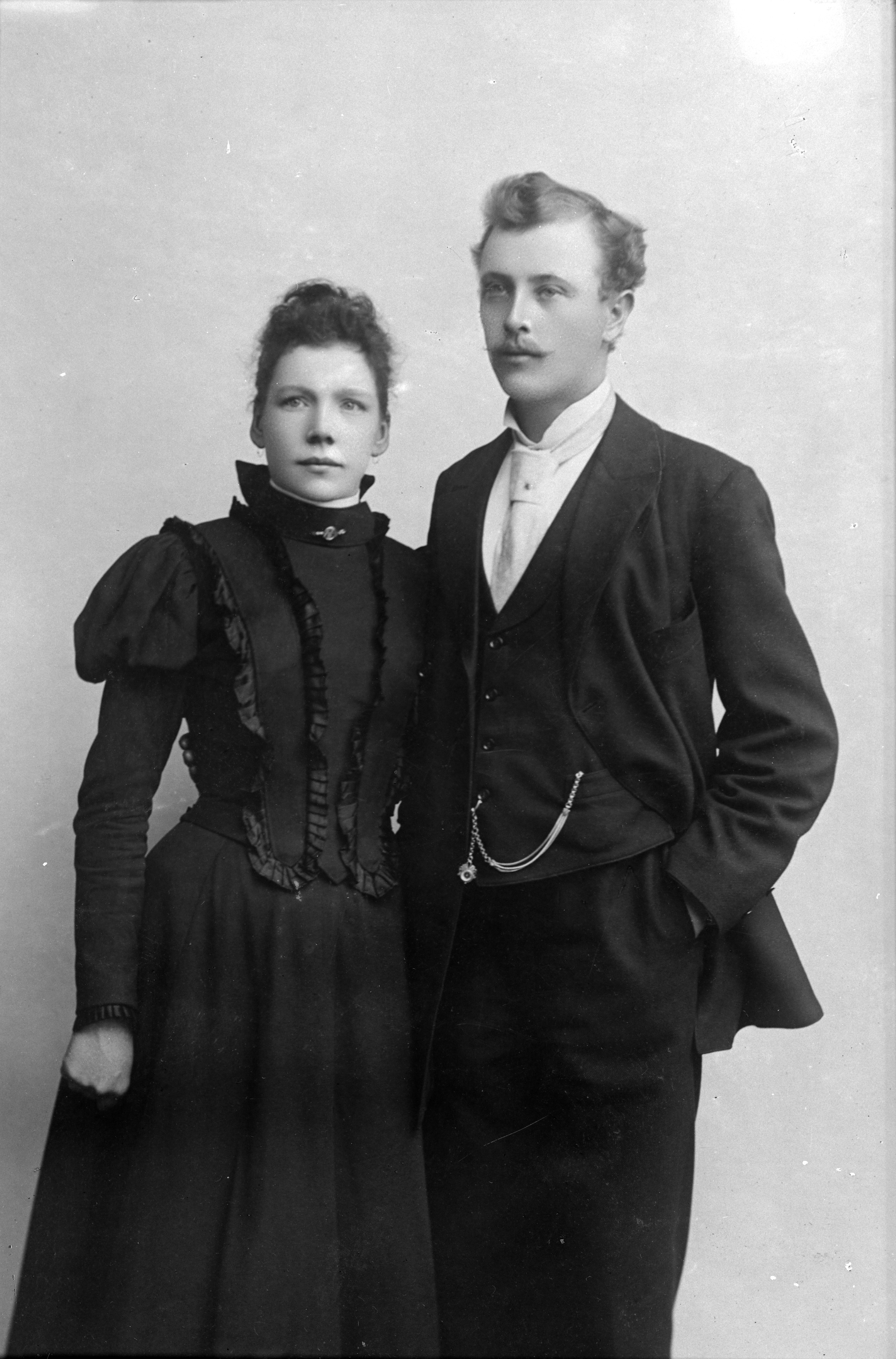 Beskrivning: Porträtt i helfigur av murare Oscar Macdonald med frun Emma Sofia.