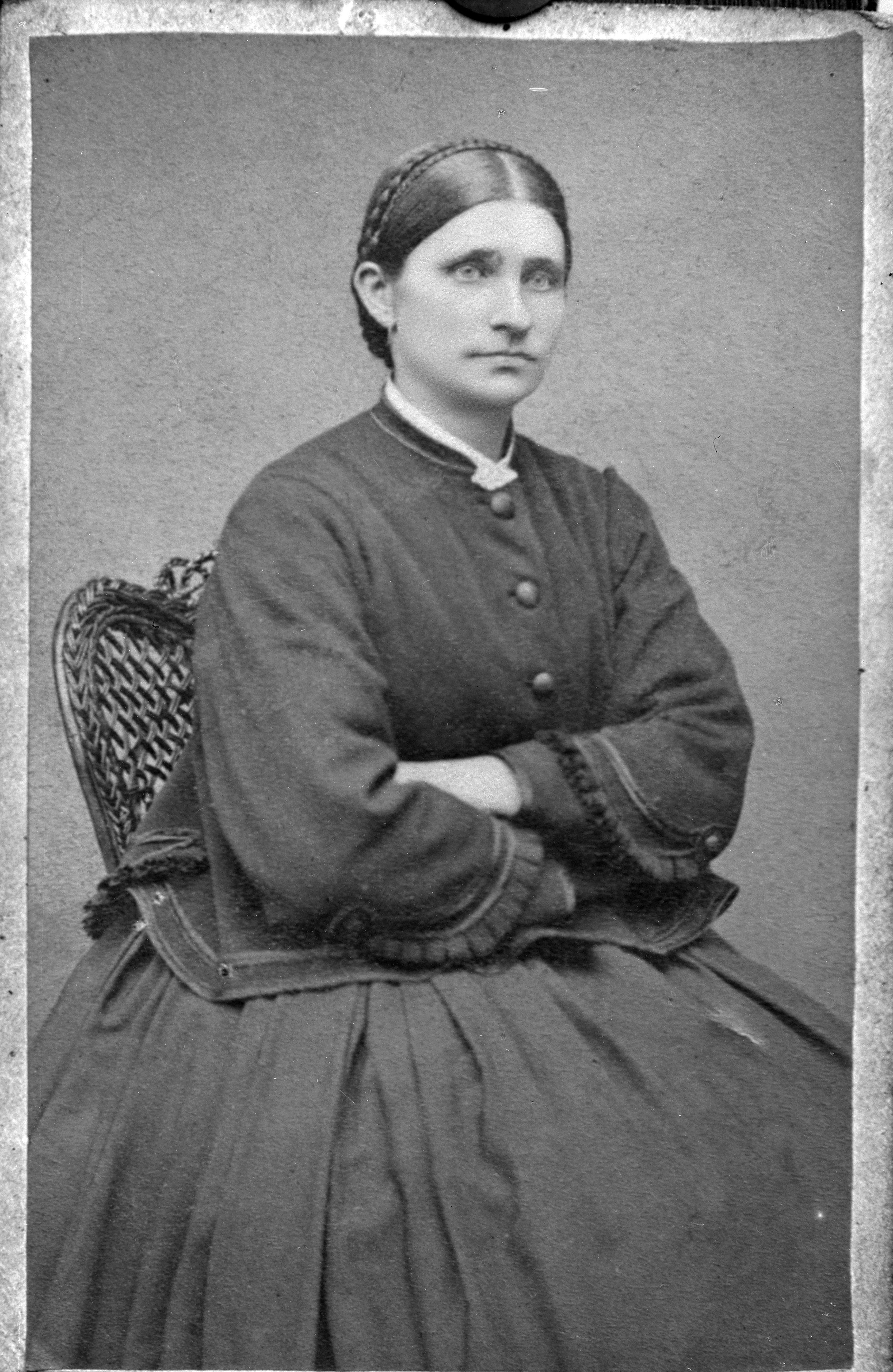 Porträtt i helfigur av oidentifierad kvinna, sittande på stol, möjligen fru Vinberg.