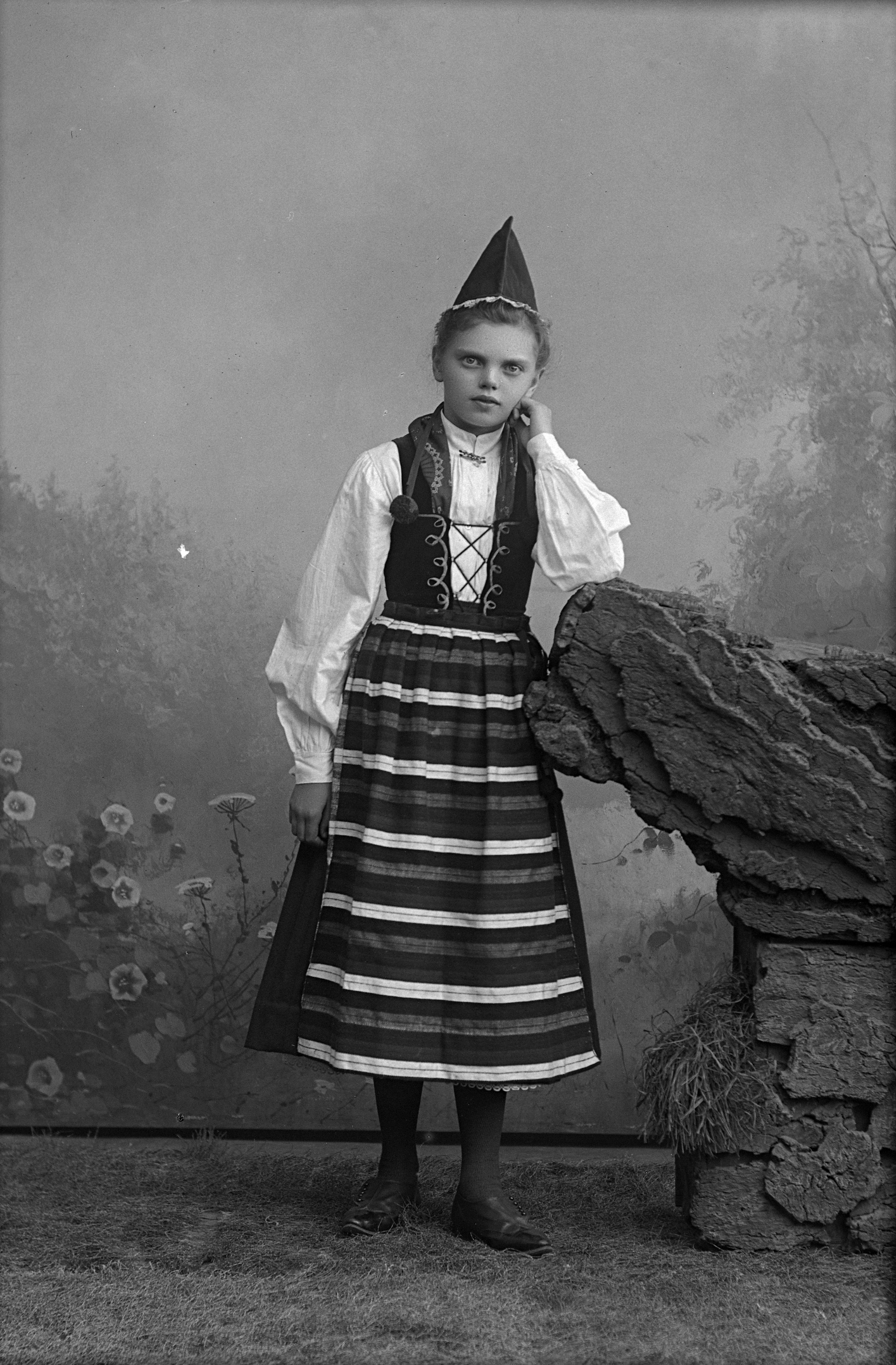 Porträtt i helfigur av Hulda Nilsson, iklädd folkdräkt, stående vid stenhäll. Fotograferad framför ateljéfond med skogs- och blomstermotiv.