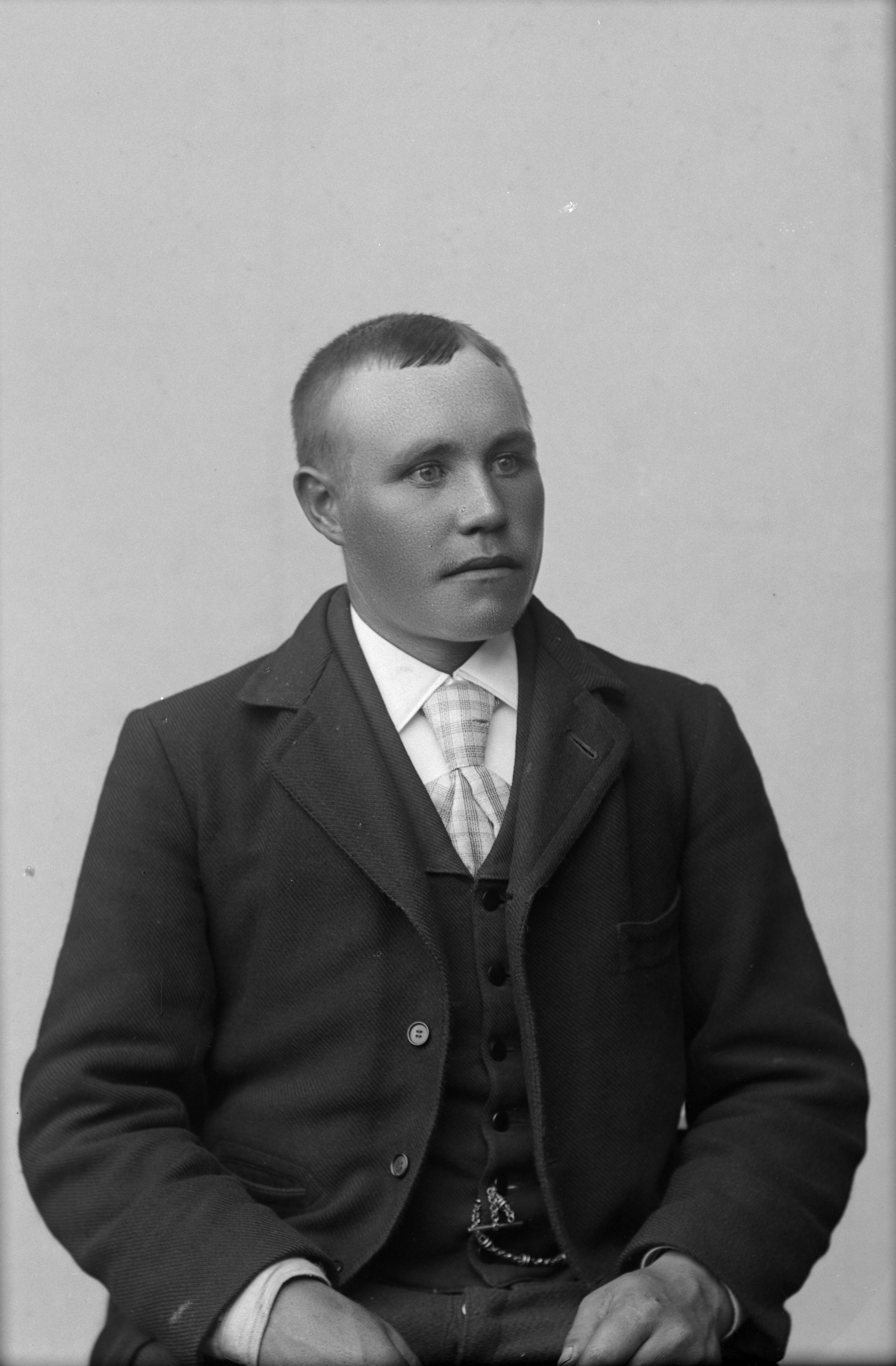 Beskrivning: Porträtt i halvfigur av J. A. Palmquist vid Klagstorps Kalkbrott.
