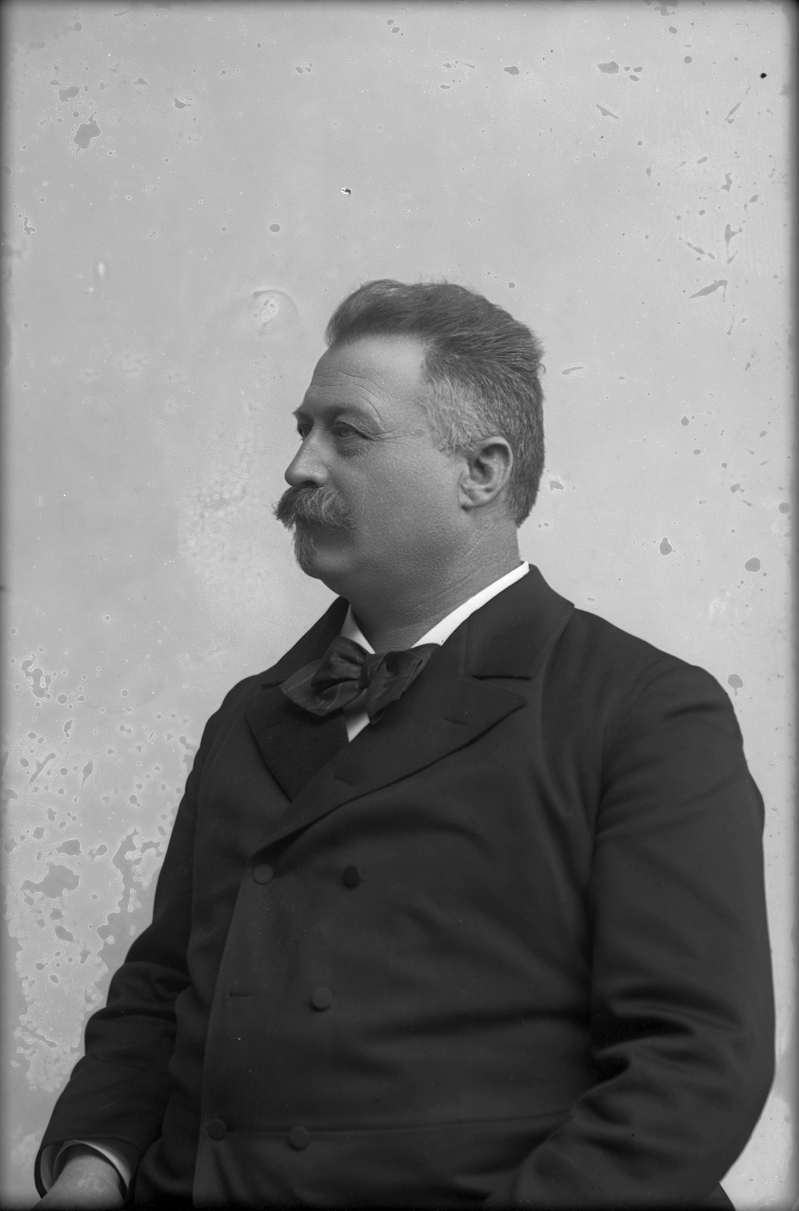 Porträtt i halvfigur av S. August Andersson, ansikte i profil.