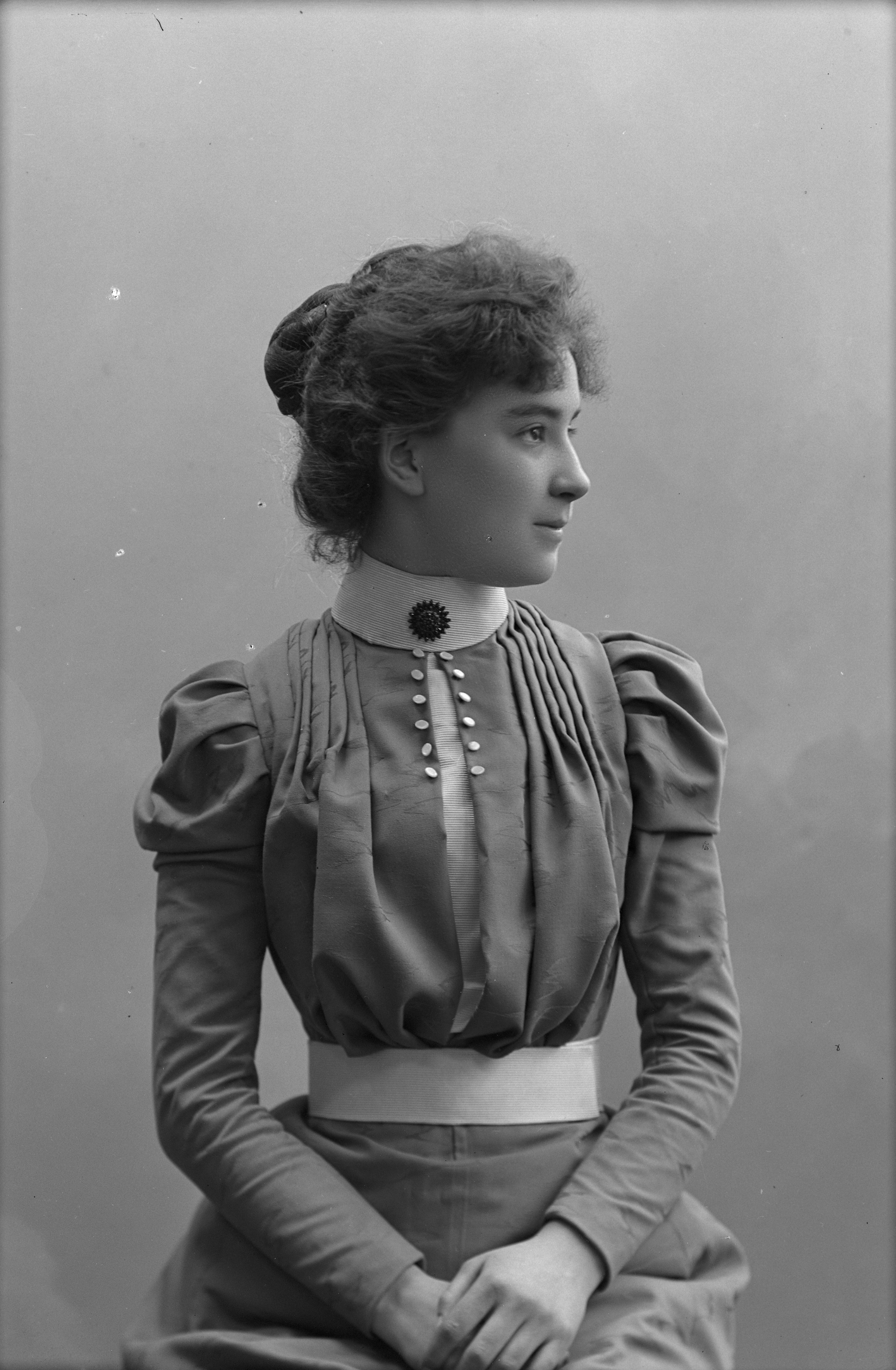 Porträtt i halvfigur av fröken Stenberg vid Malmö Nya Garnbod, ansikte i profil.