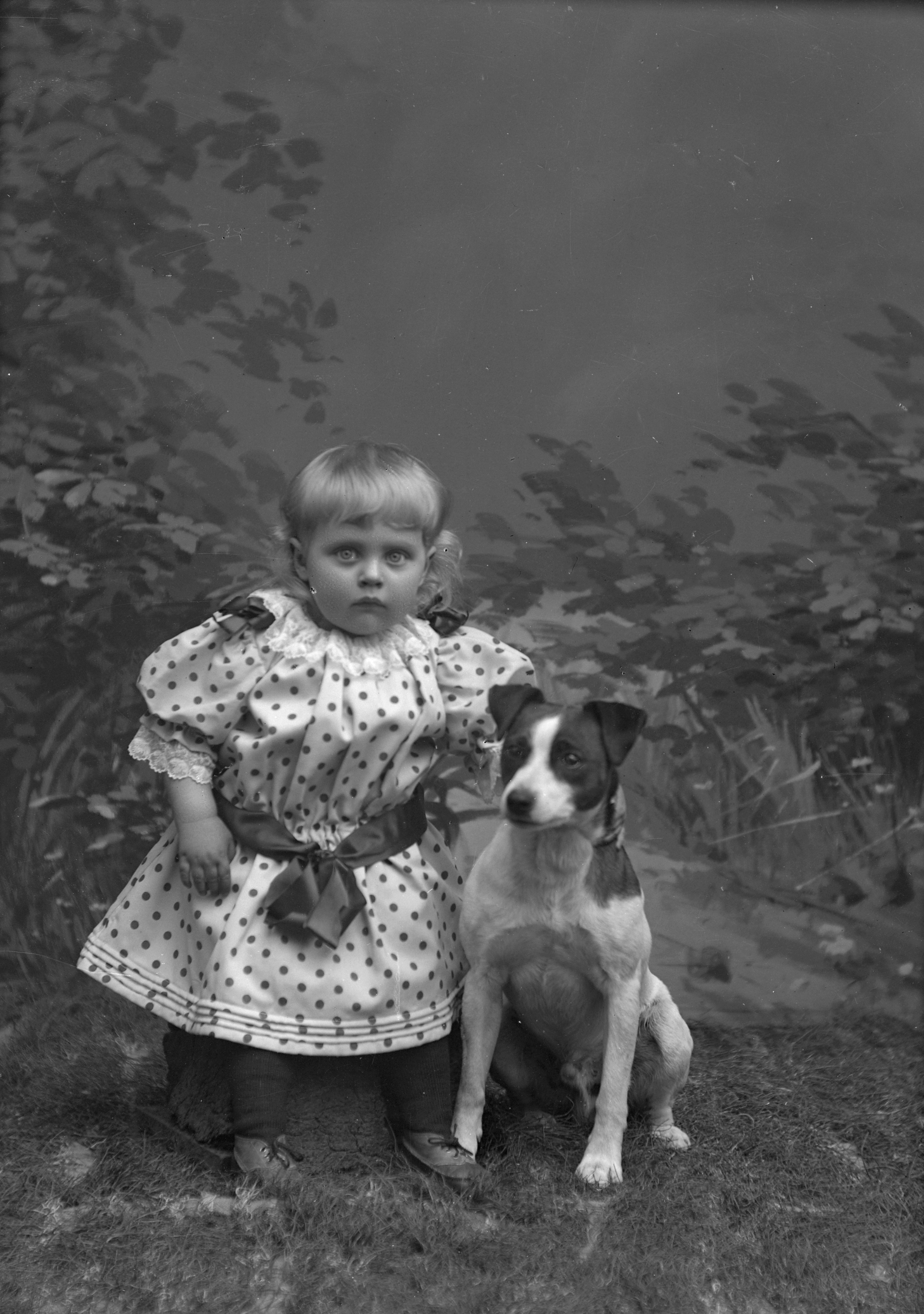 Porträtt i helfigur av Normans dotter, sittande på stenhäll med hund. Fotograferad framför ateljéfond med skogs- och blomstermotiv.