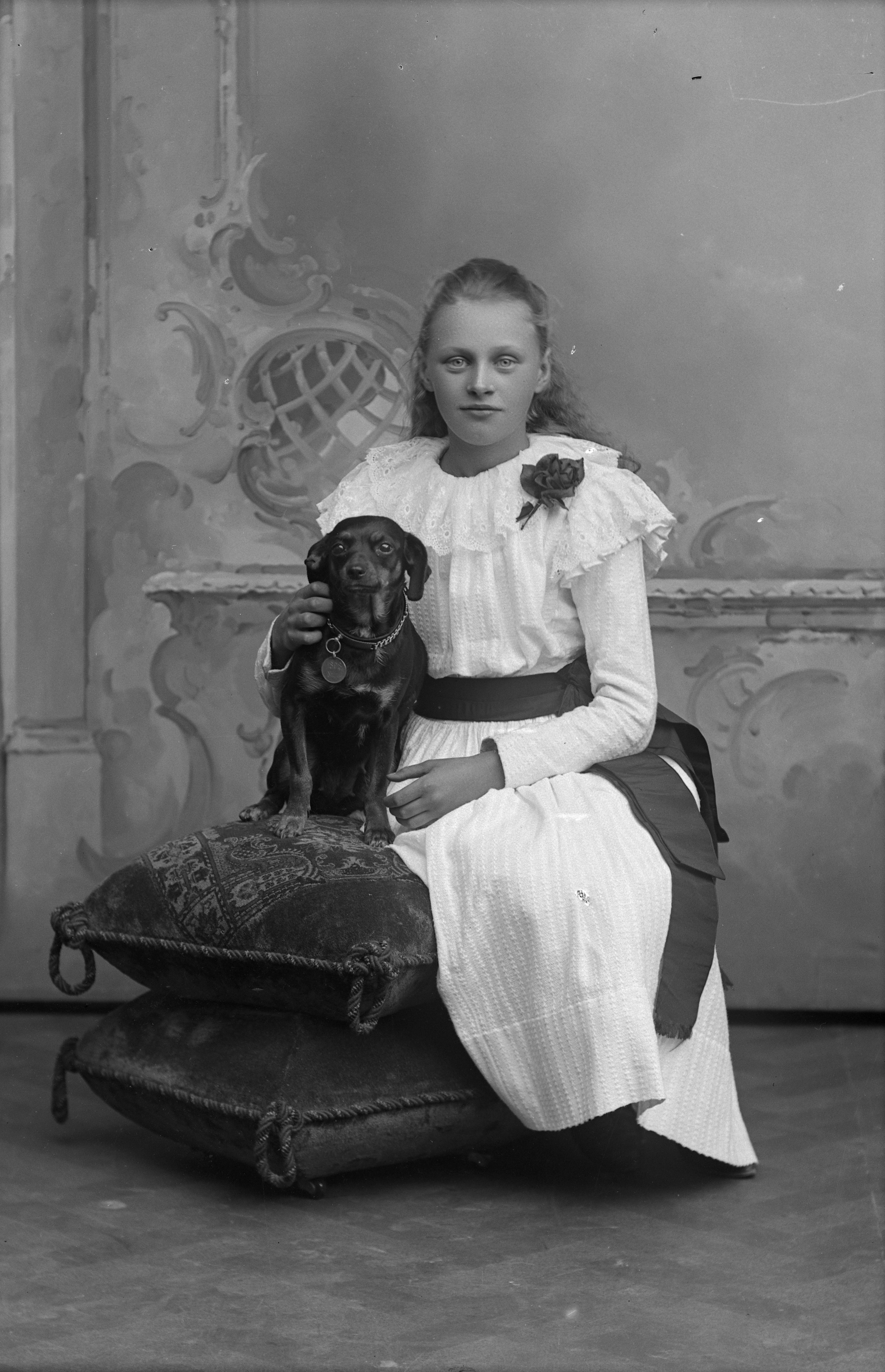 Porträtt i helfigur av fröken Lindbeck, sittande på stor dyna, med hund.