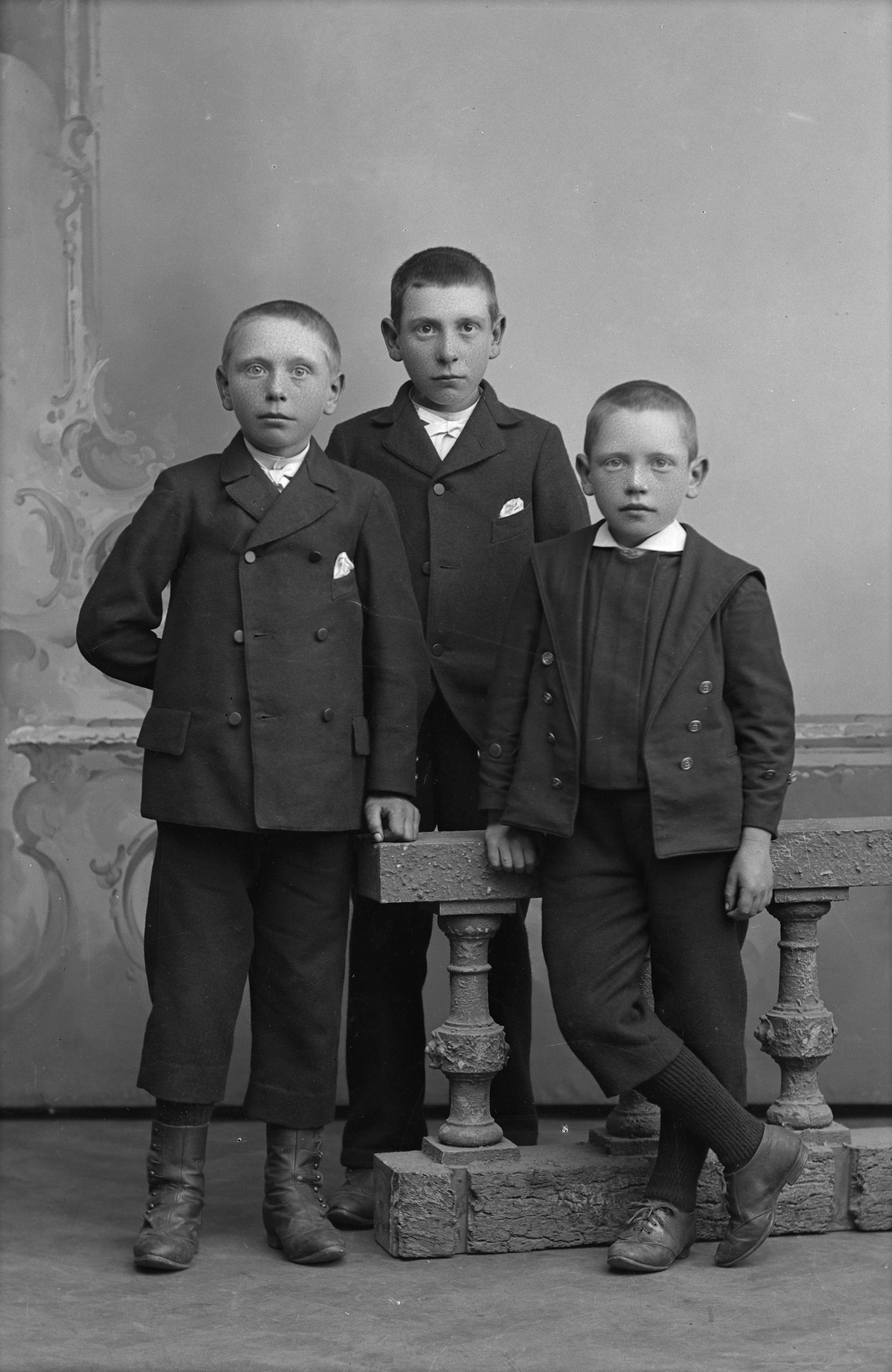 Porträtt i helfigur av Per Hanssons söner, stående vid stenstaket med balustrad.