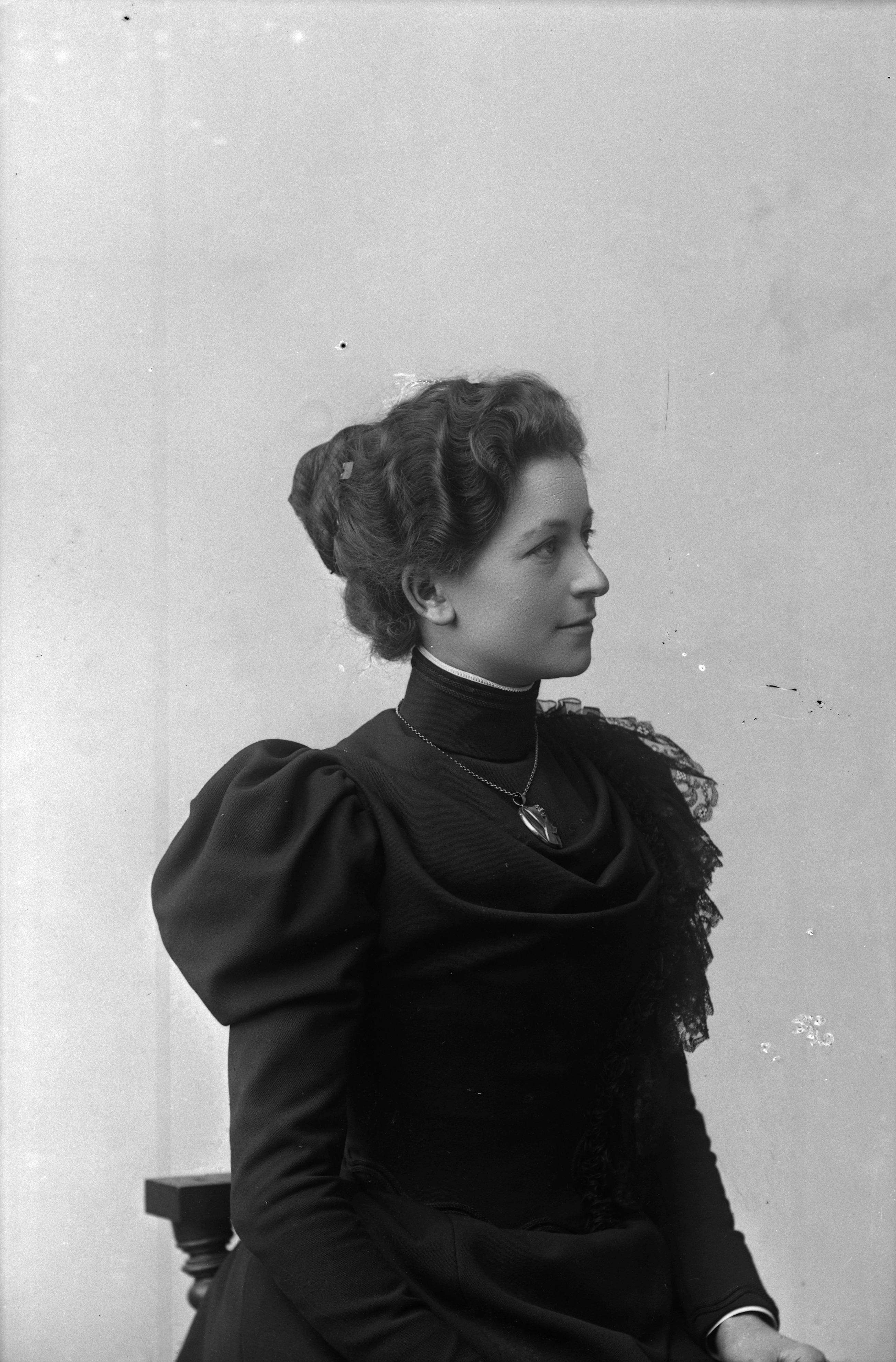 Porträtt i halvfigur av oidentifierad kvinna, ansikte i profil.