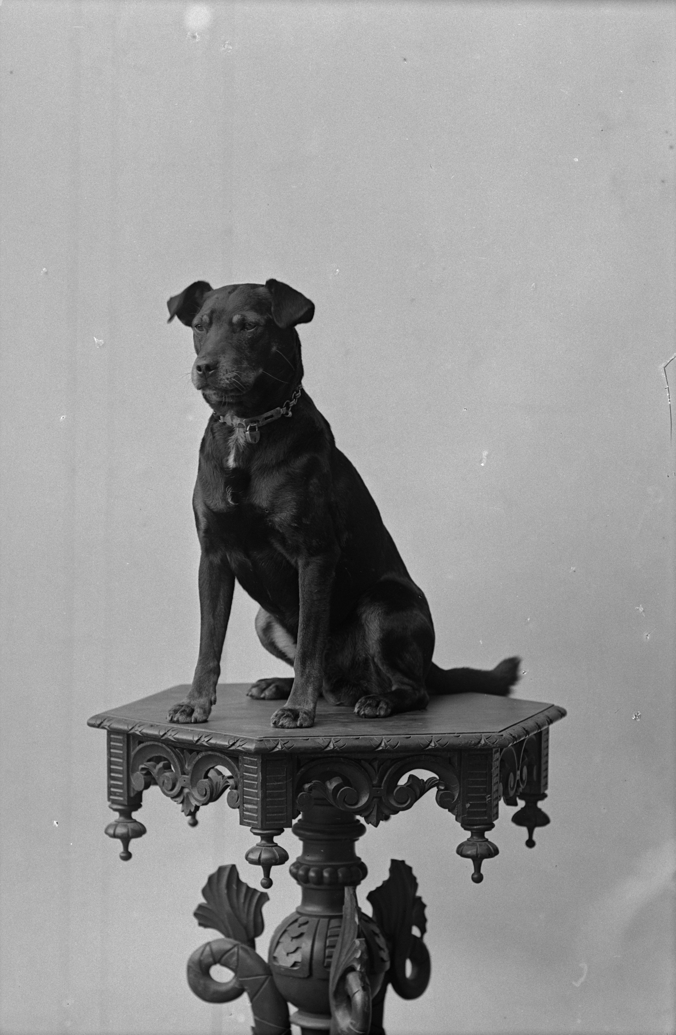 Porträtt av Ellen Håkanssons hund, sittand på bord.