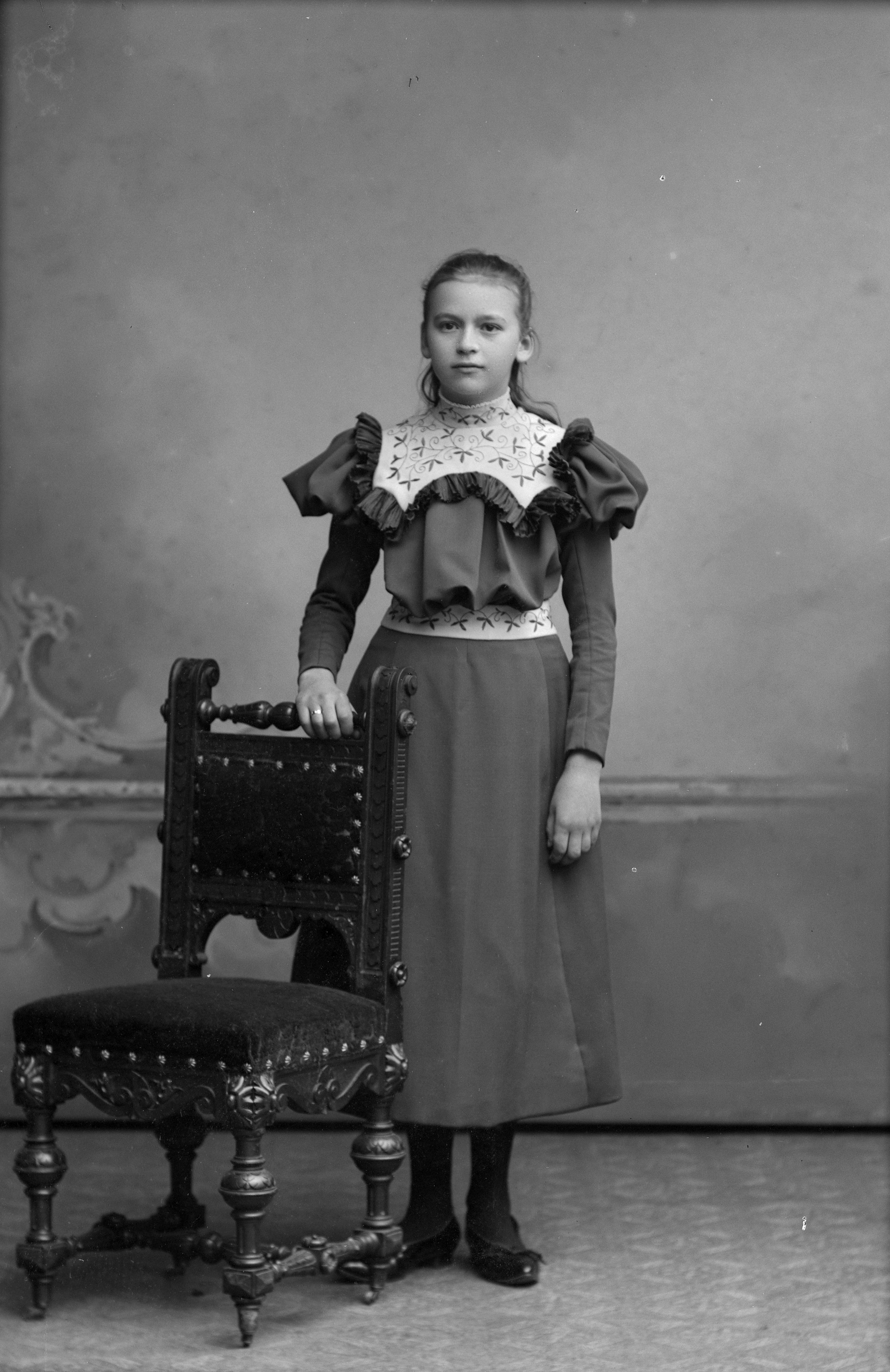 Porträtt i helfigur av Siri Johnsson, butiksbiträde i smöraffär, stående vid stol.
