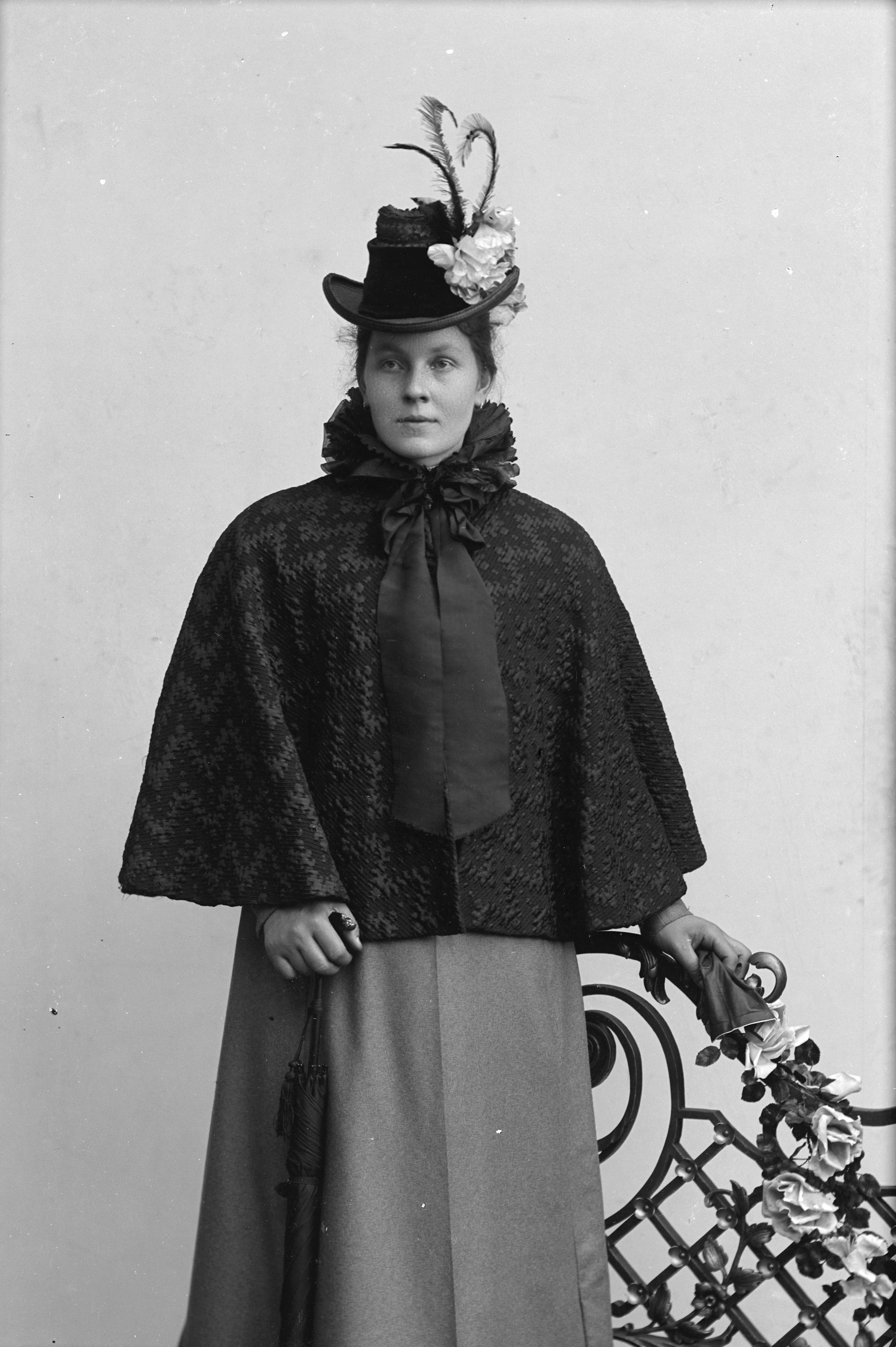 Porträtt i helfigur av Mathilda Magnusson, iklädd hatt och cape, stående vid spaljé med blomster.