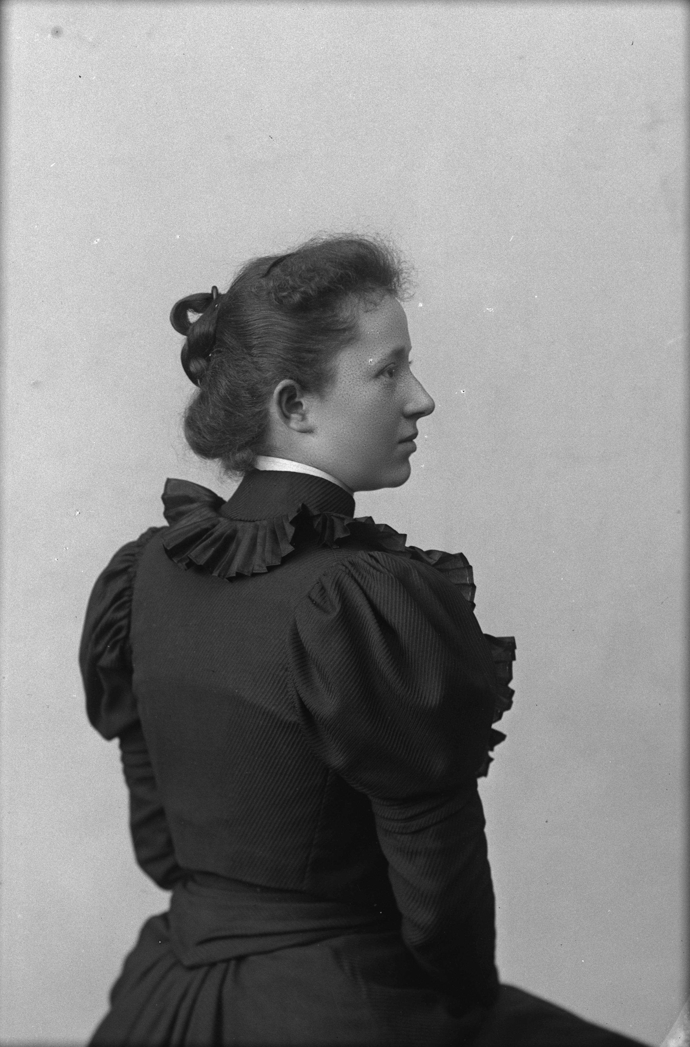Porträtt i halvfigur av Blända Öhrnberg, ryggen vänd snett mot kameran, ansikte i profil.