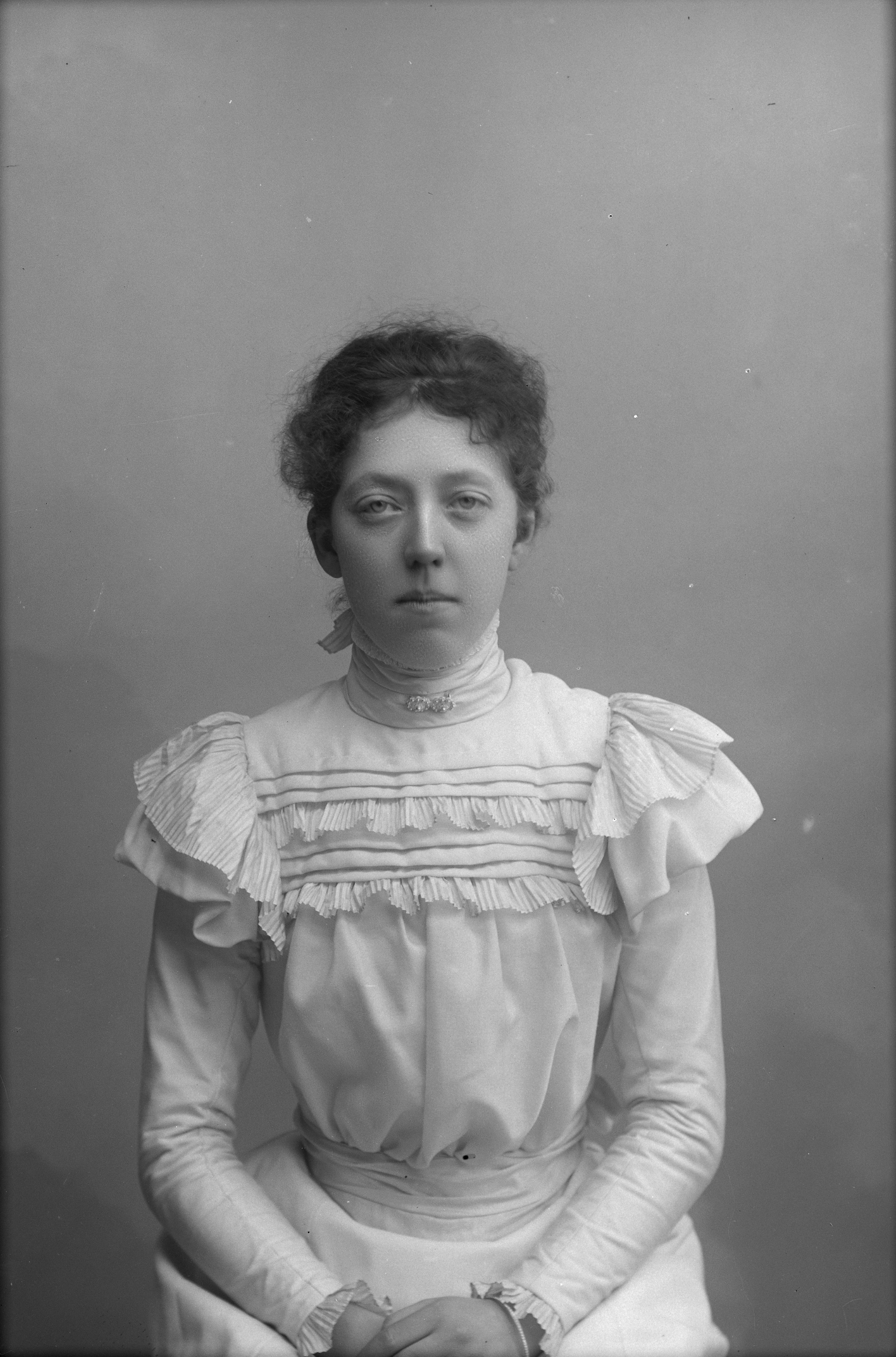Beskrivning: Porträtt i halvfigur av handelsbiträdet Alma Sundberg.