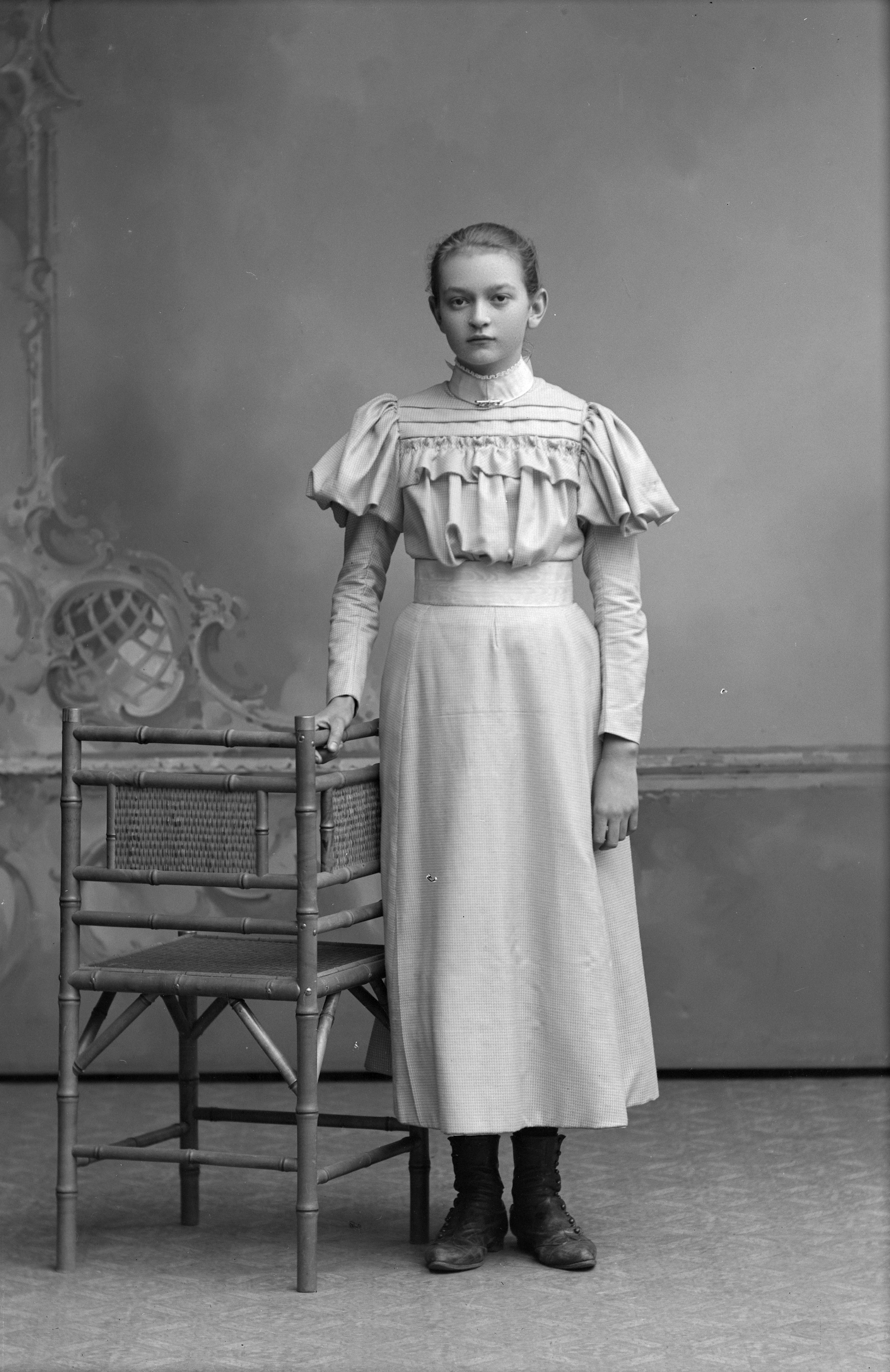 Porträtt i helfigur av Hildur Johnsson, butiksbiträde i smöraffär, stående vid stol.