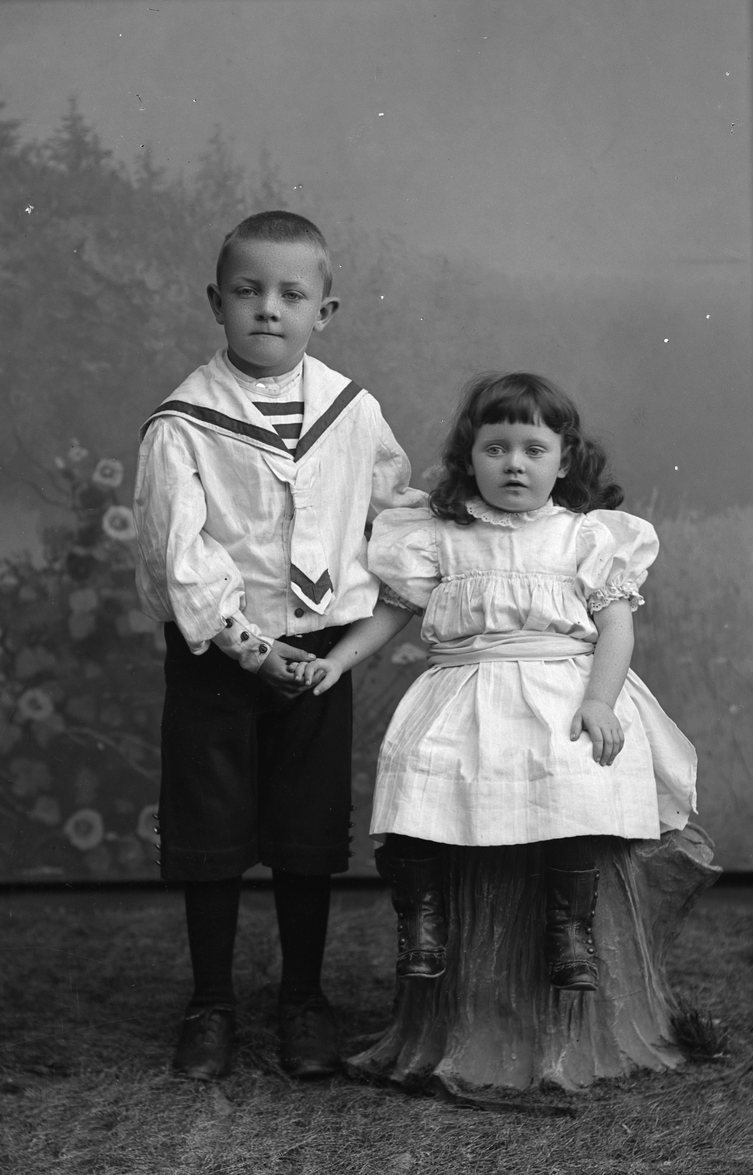 Porträtt i helfigur av Olav och Karin Olivia Landås. Dottern, sittande på stubbe, sonen, iklädd sjömanskostym, stående bredvid. Ateljéfond med skogs- och blomstermotiv utgör bakgrunden.