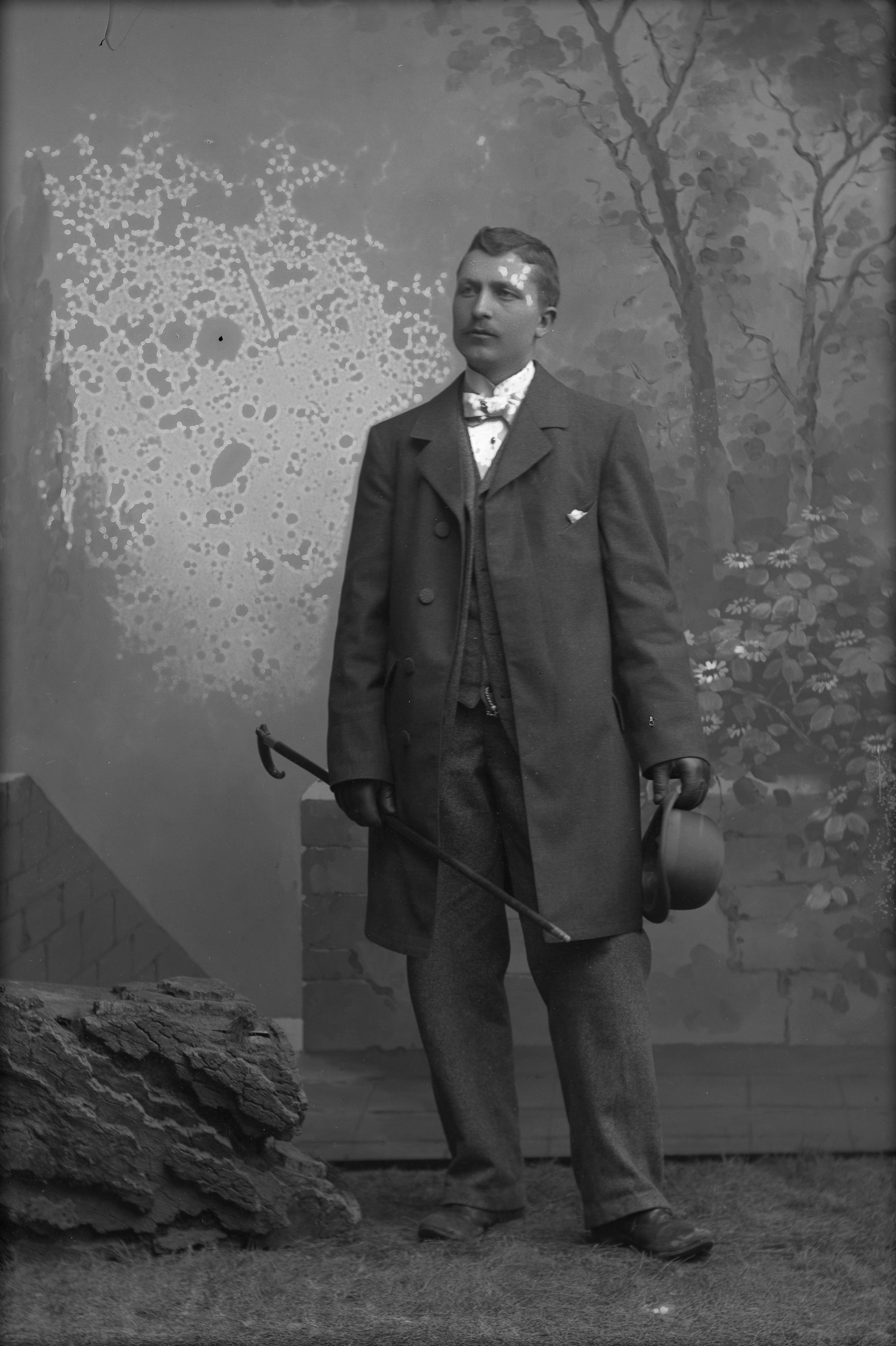 Porträtt i helfigur av John Eriksson, iklädd ytterrock, hållande hatt och käpp, stående vid stenhäll. Fotograferad framför ateljéfond med skogs- och blomstermotiv.