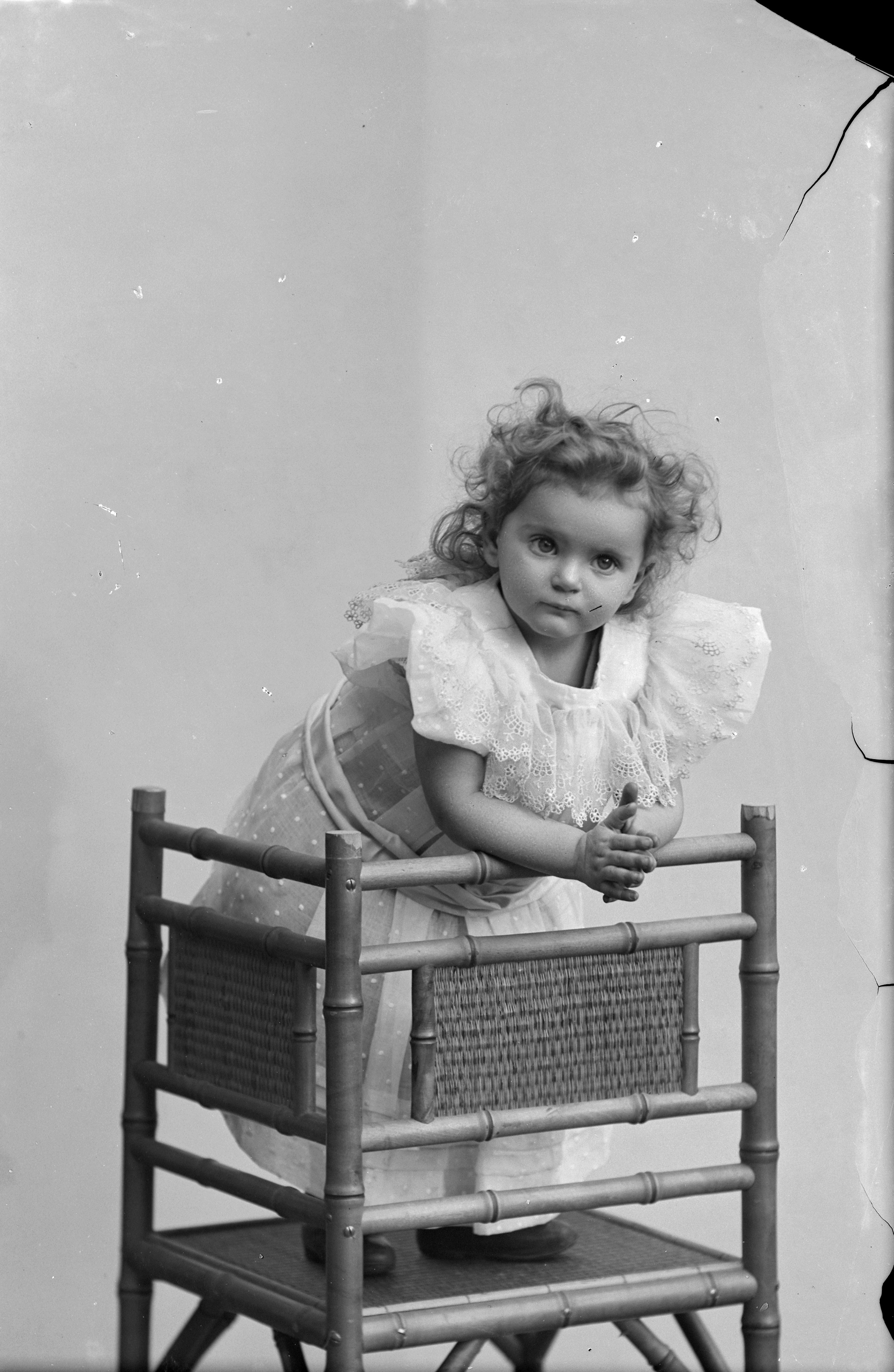 Porträtt i helfigur av Greta Pulschau, stående på stol.