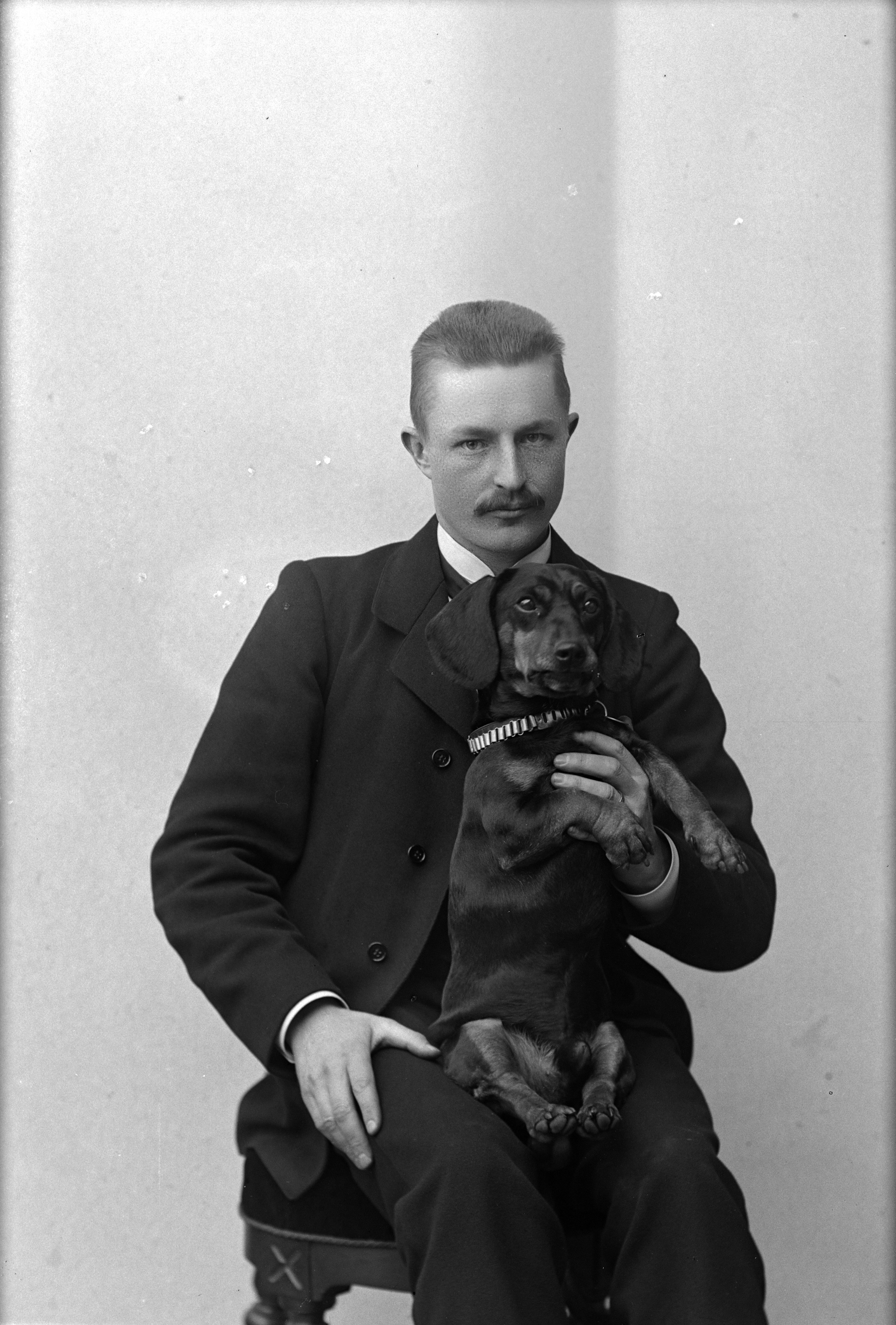Porträtt i helfigur av ingenjören, linjedirektör Sven Otto Larsson Lennman, hållande sin hund i knät.