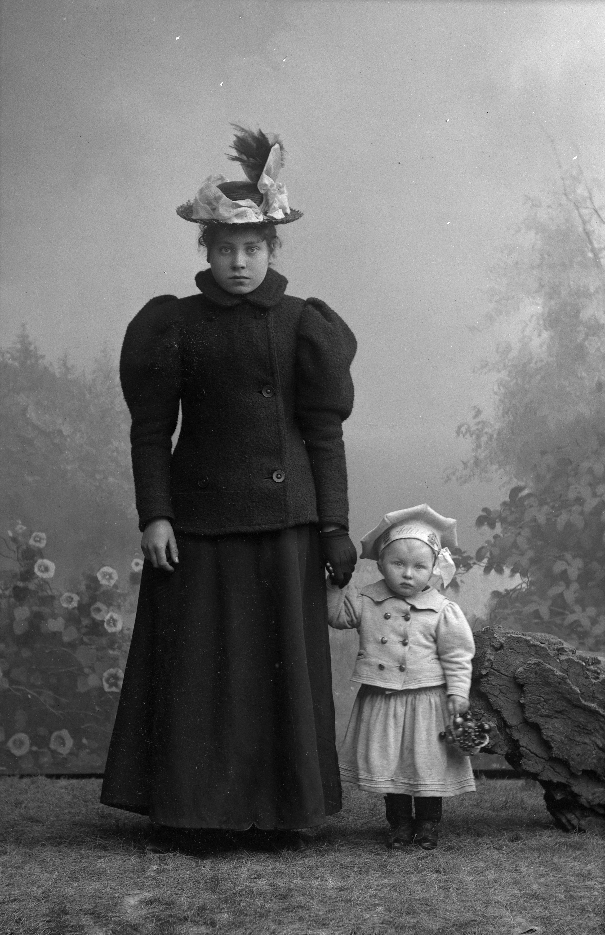 Porträtt i helfigur av Elna Mårtensson med oidentifierat barn. Hon iklädd hatt och kappa, barnet i hatt, hållande liten korg. Ateljéfond med skogs- och blomstermotiv utgör bakgrunden.