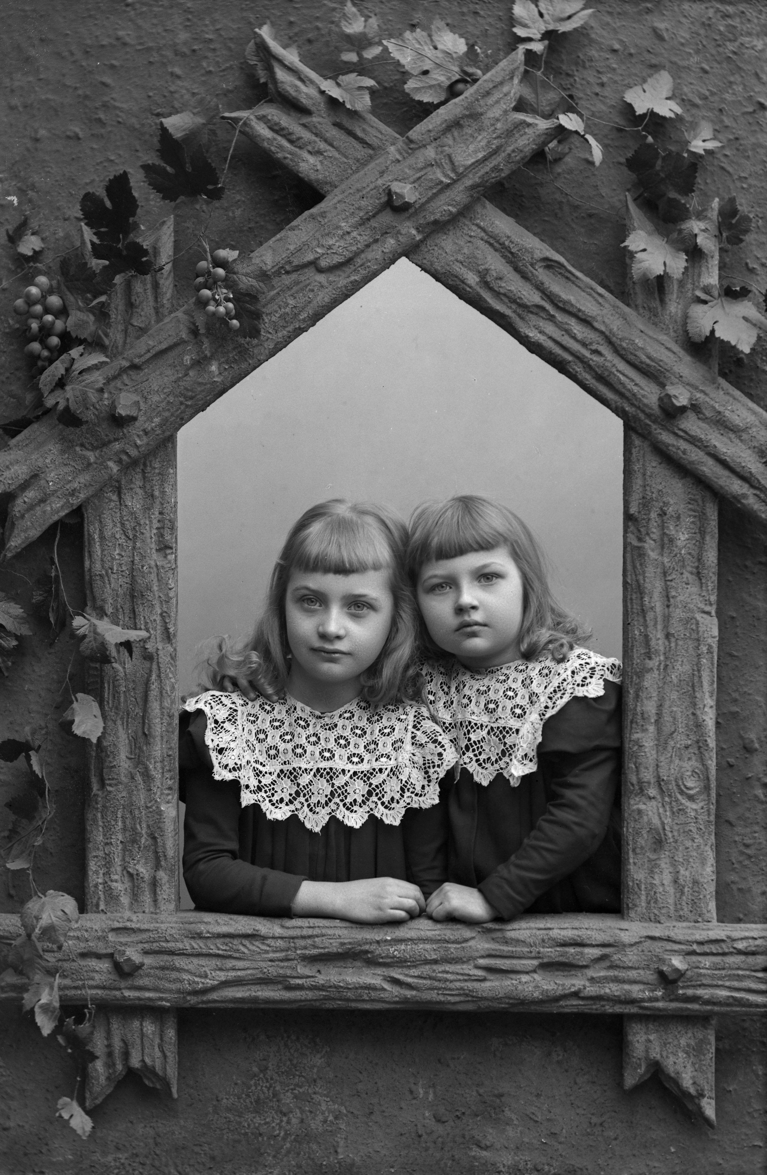 Porträtt i halvfigur av Svenssons döttrar, fotograferade stående i fönsterkuliss dekorerad med vinranka.