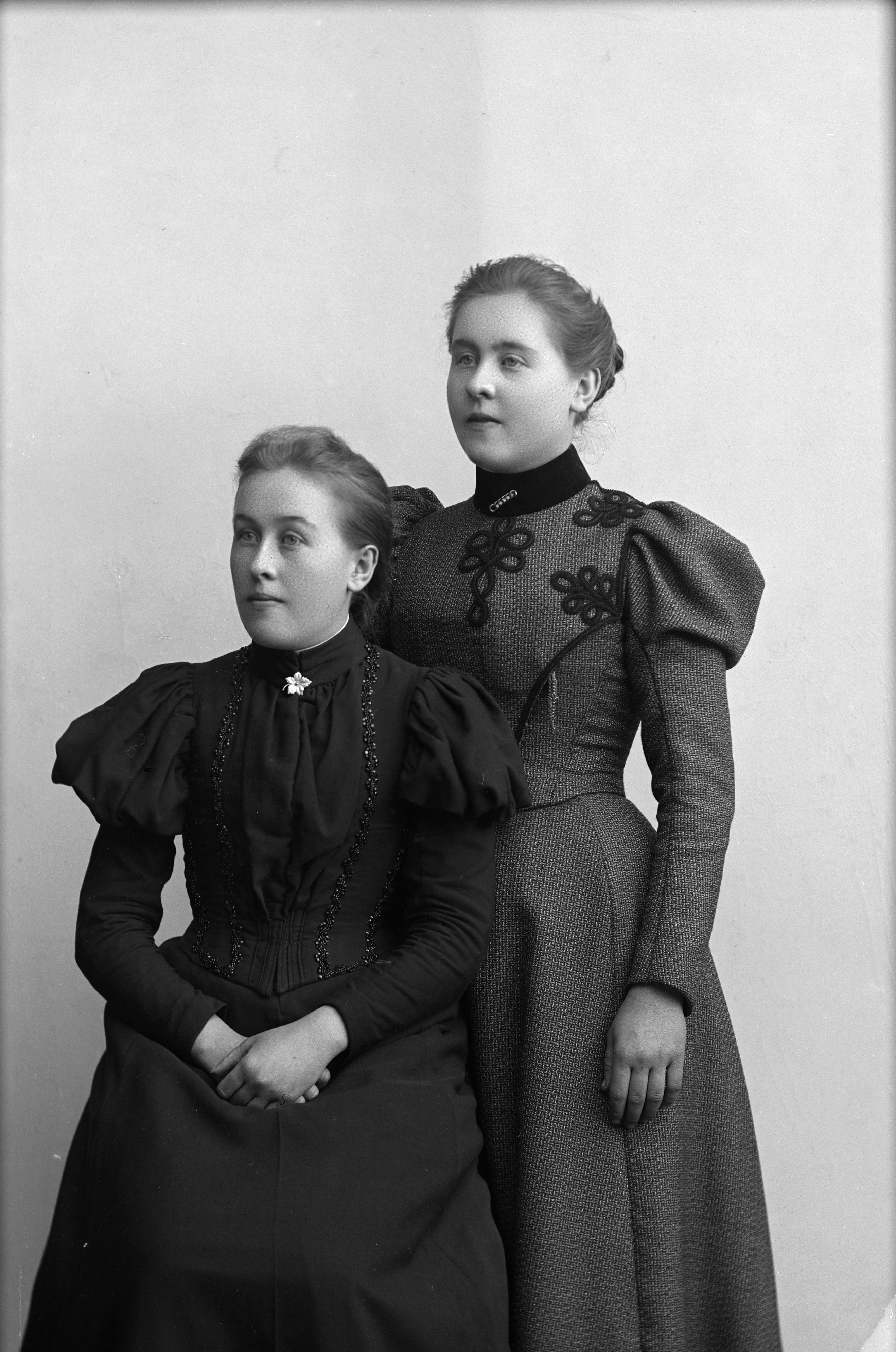 Beskrivning: Porträtt i helfigur av Hilma Jonsson med kvinna. Hilma Jonsson stående.