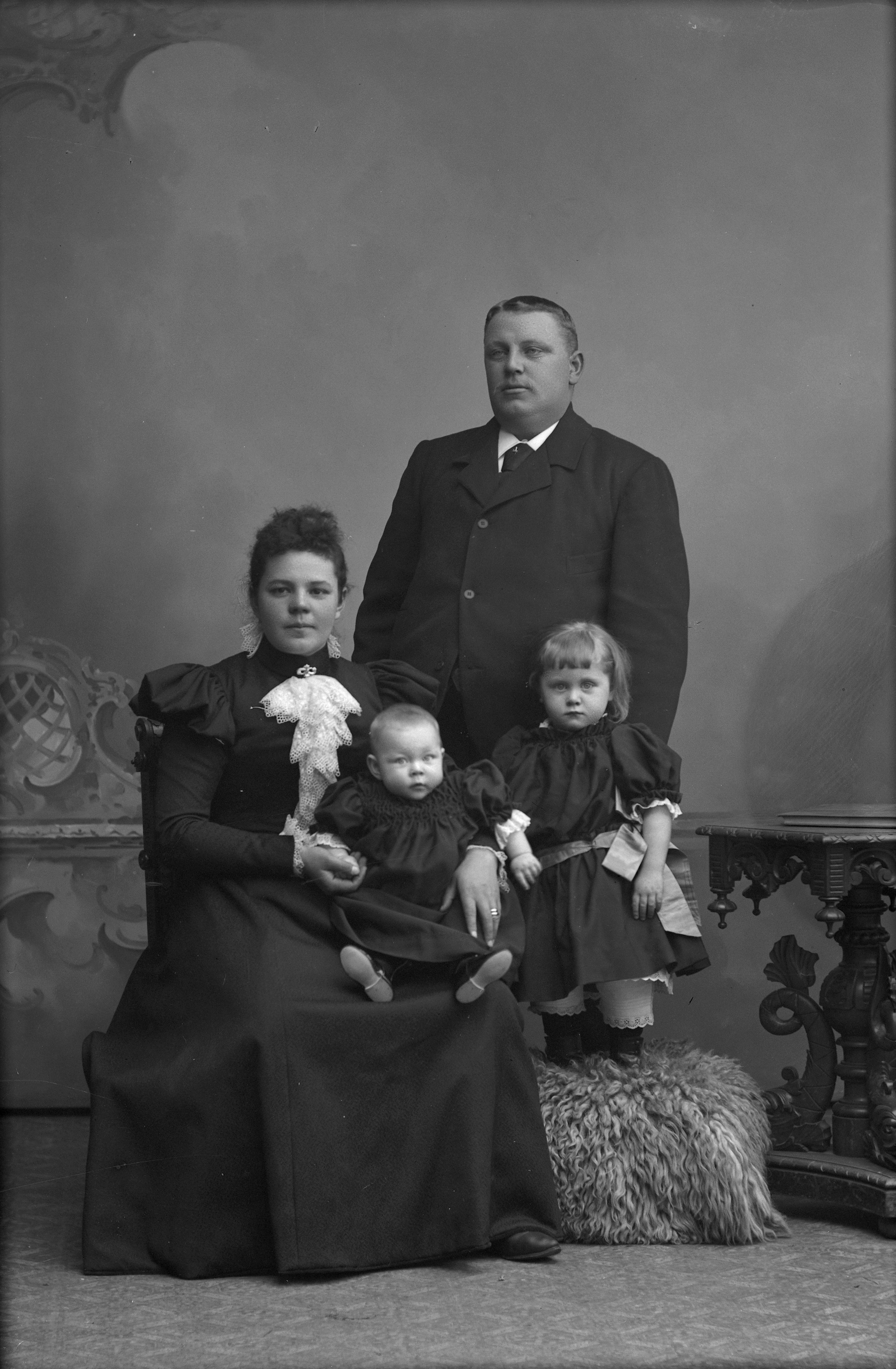 Porträtt i helfigur av E. Olsson med familj. Modern sittande med yngsta barnet i knät. Pelarbord till höger i bild.