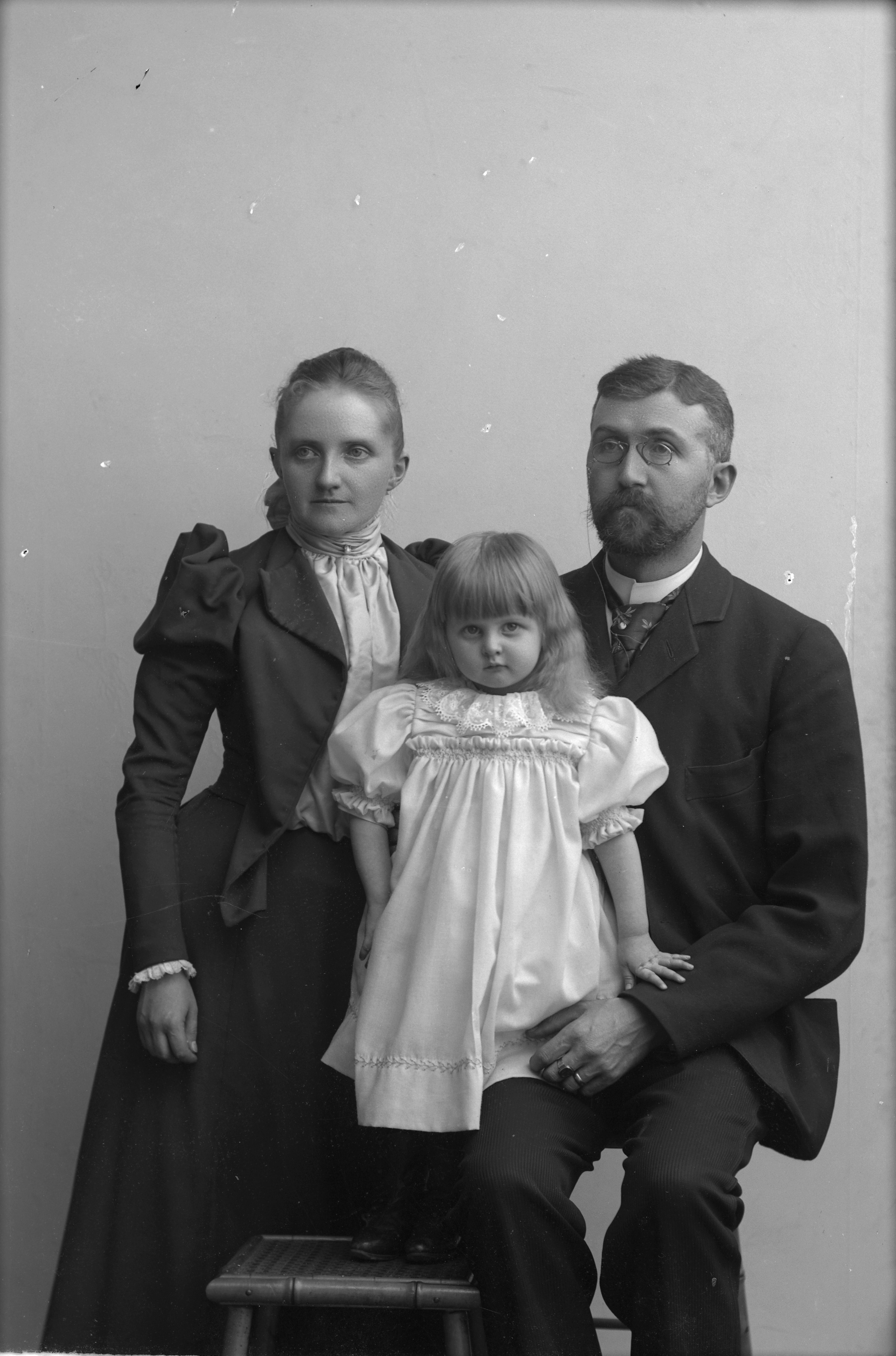 Porträtt i helfigur av länsbokhållare von Platen med familj. Dottern stående på pall /Västergatan.