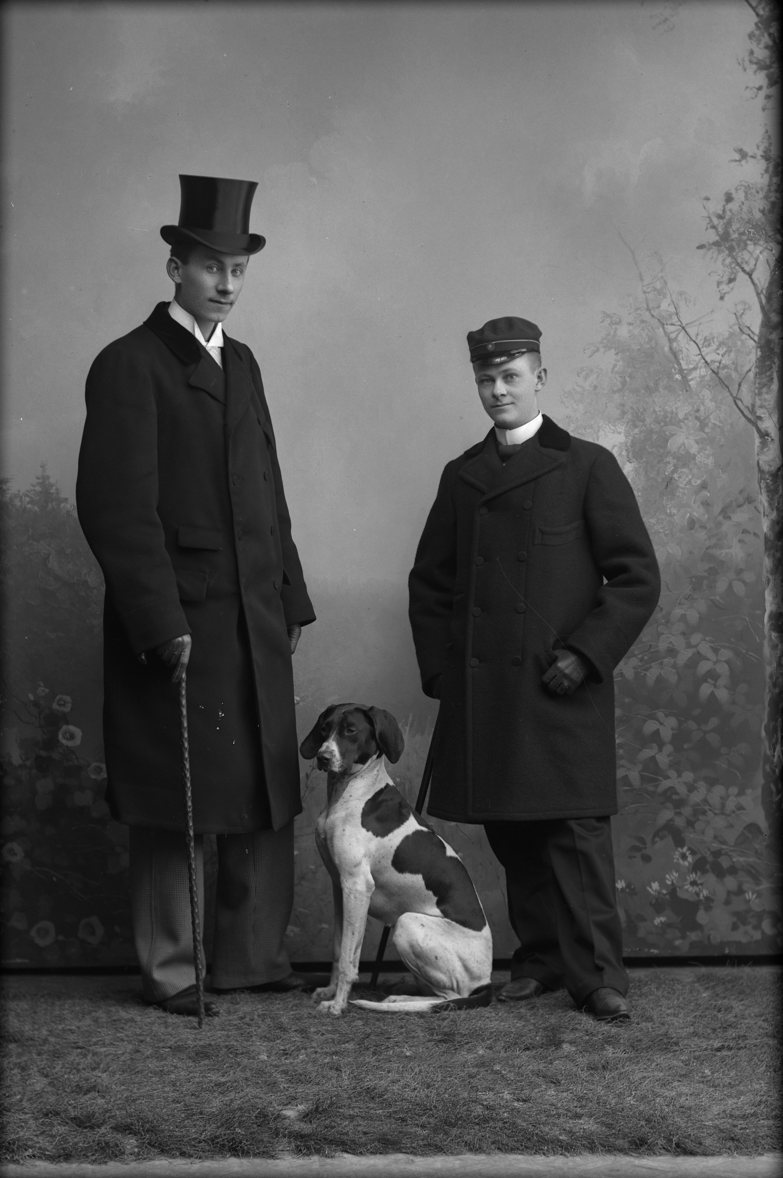 Porträtt i helfigur av E. Borgquist med okänd man. En av männen iklädd hög hatt och ytterrock, hållande käpp. Den andra iklädd skärmmössa och ytterrock. Hund sittande mellan dem. Fotograferade framför ateljéfond med skogs- och blomstermotiv.