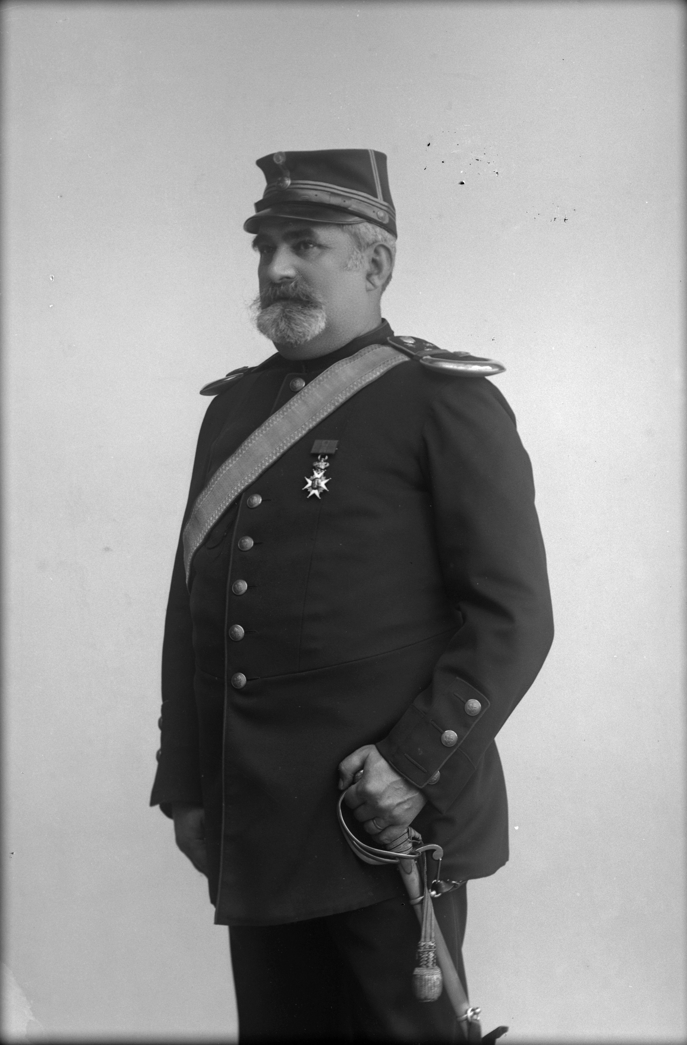Porträtt i helfigur av regementsveterinär Hedvall, iklädd militäruniform och -mössa, hållande sabel. Medalj på bröstet.