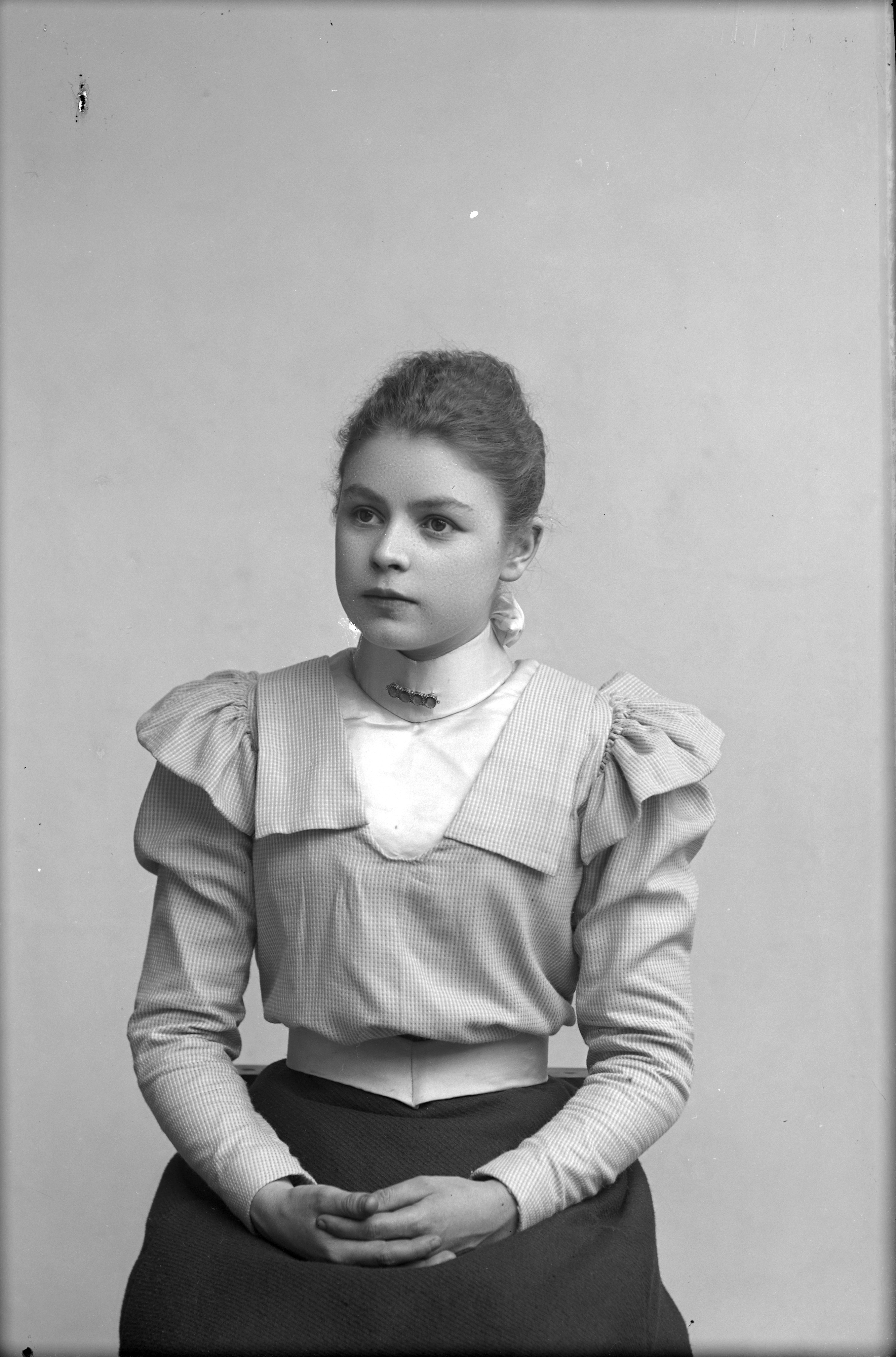 Beskrivning: Porträtt i halvfigur av Mina Andersson i Anderslöv.