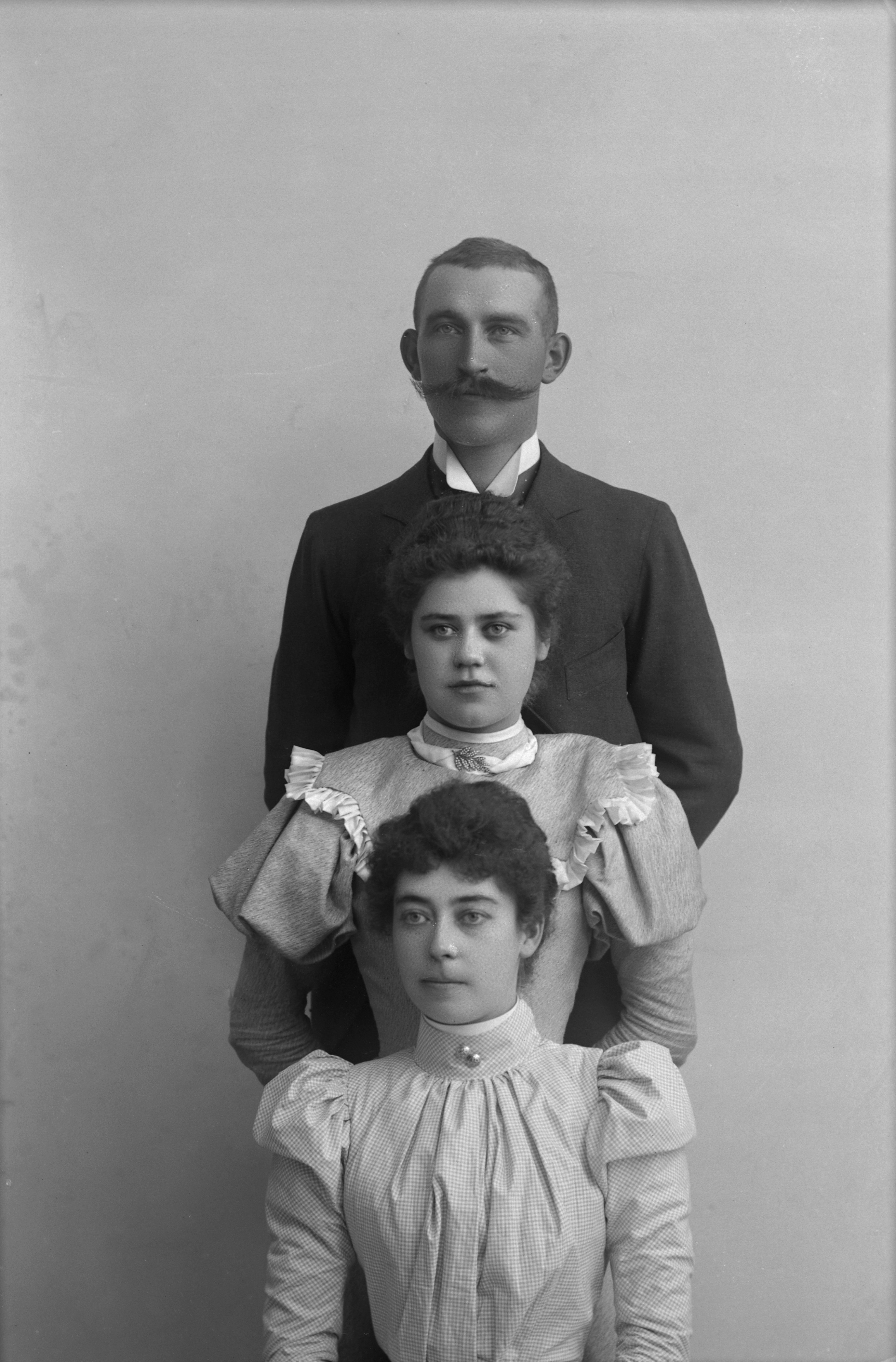 Porträtt i helfigur av tegelbruksdisponent Artur A. Fischer med frun Ida och okänd kvinna, stående bakom varandra på rad.