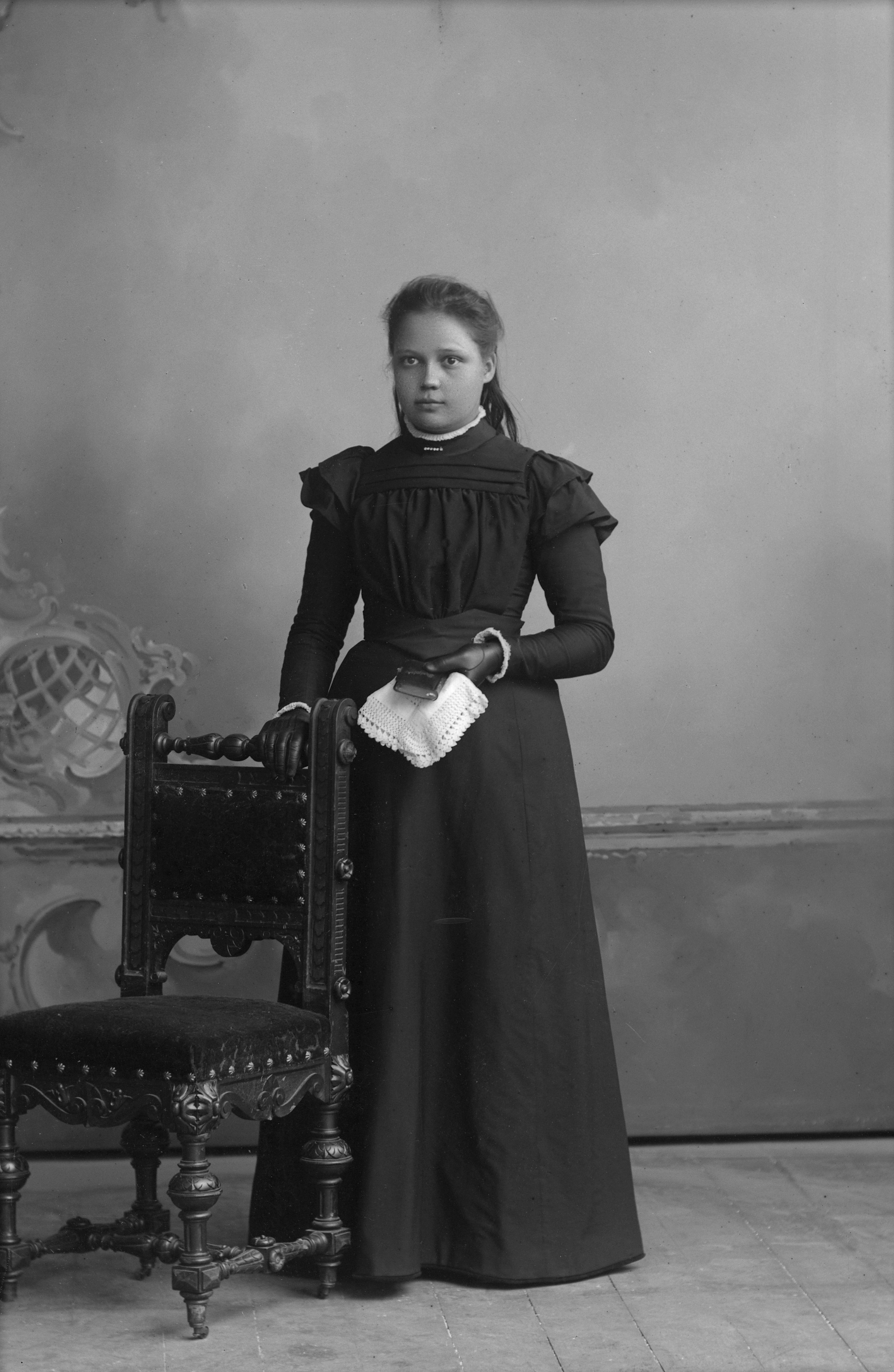 Porträtt i helfigur av Anna Hansson, stående vid stol, hållande liten tygduk och portmonnä.