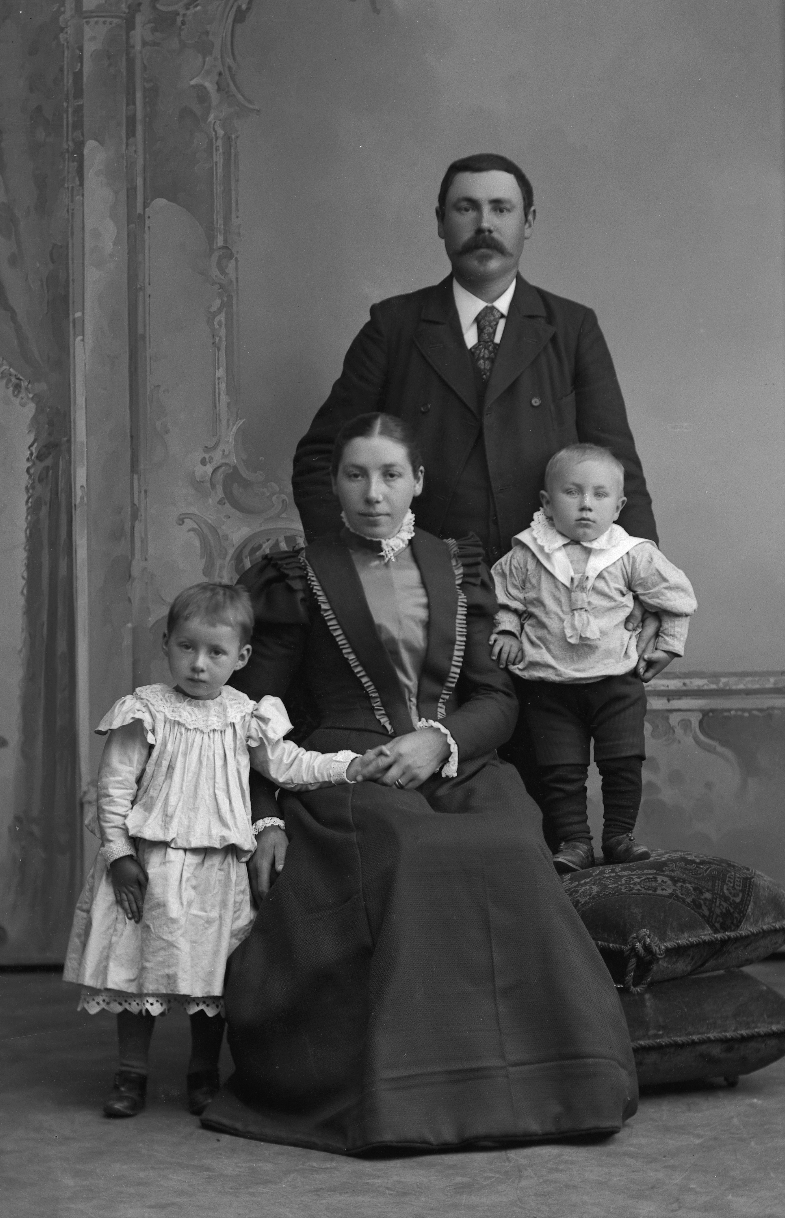 Porträtt i helfigur av P. Thunell med famiilj, sittande och stående.