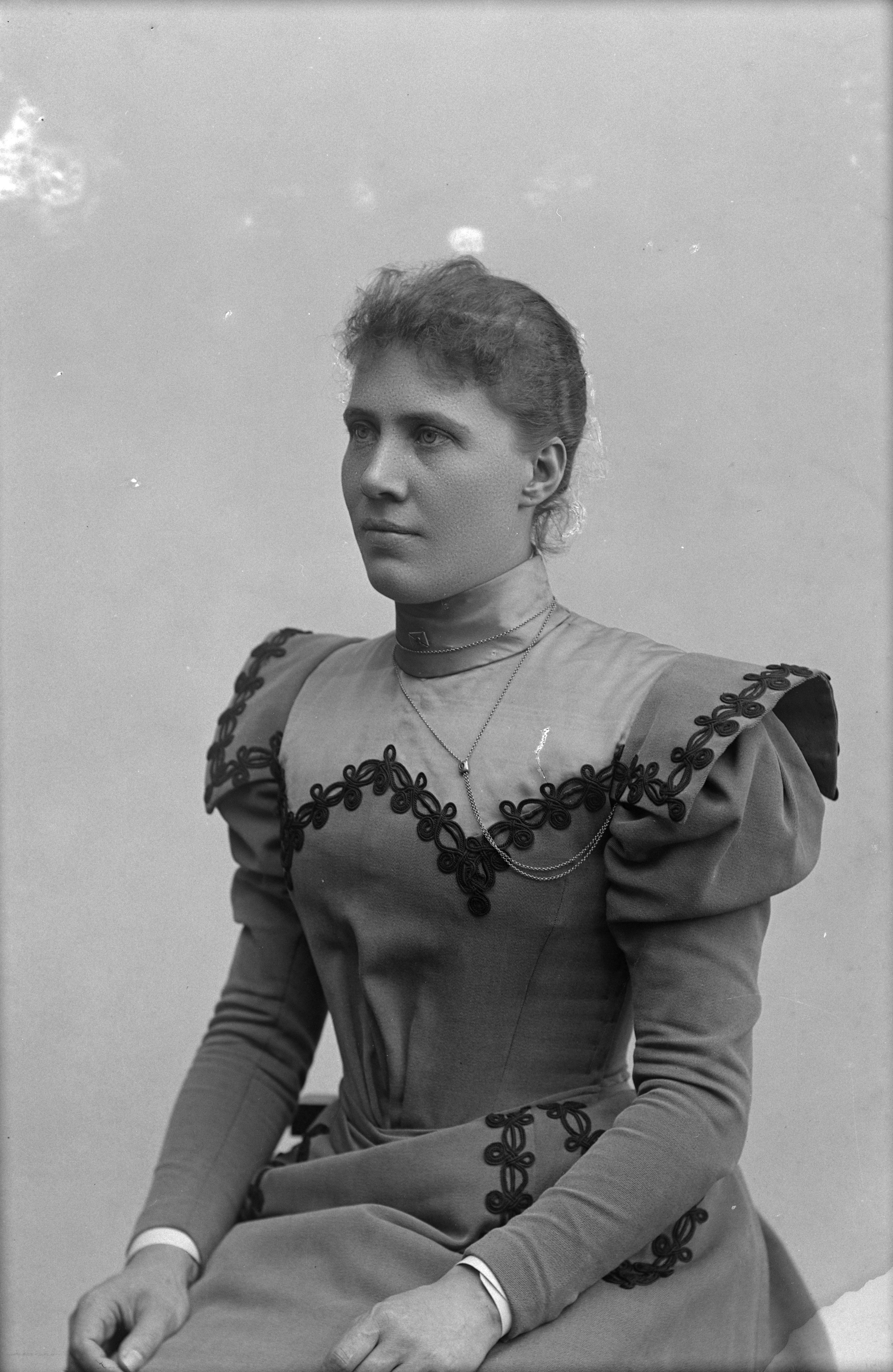 Beskrivning: Porträtt i halvfigur av fröken Grönberg.