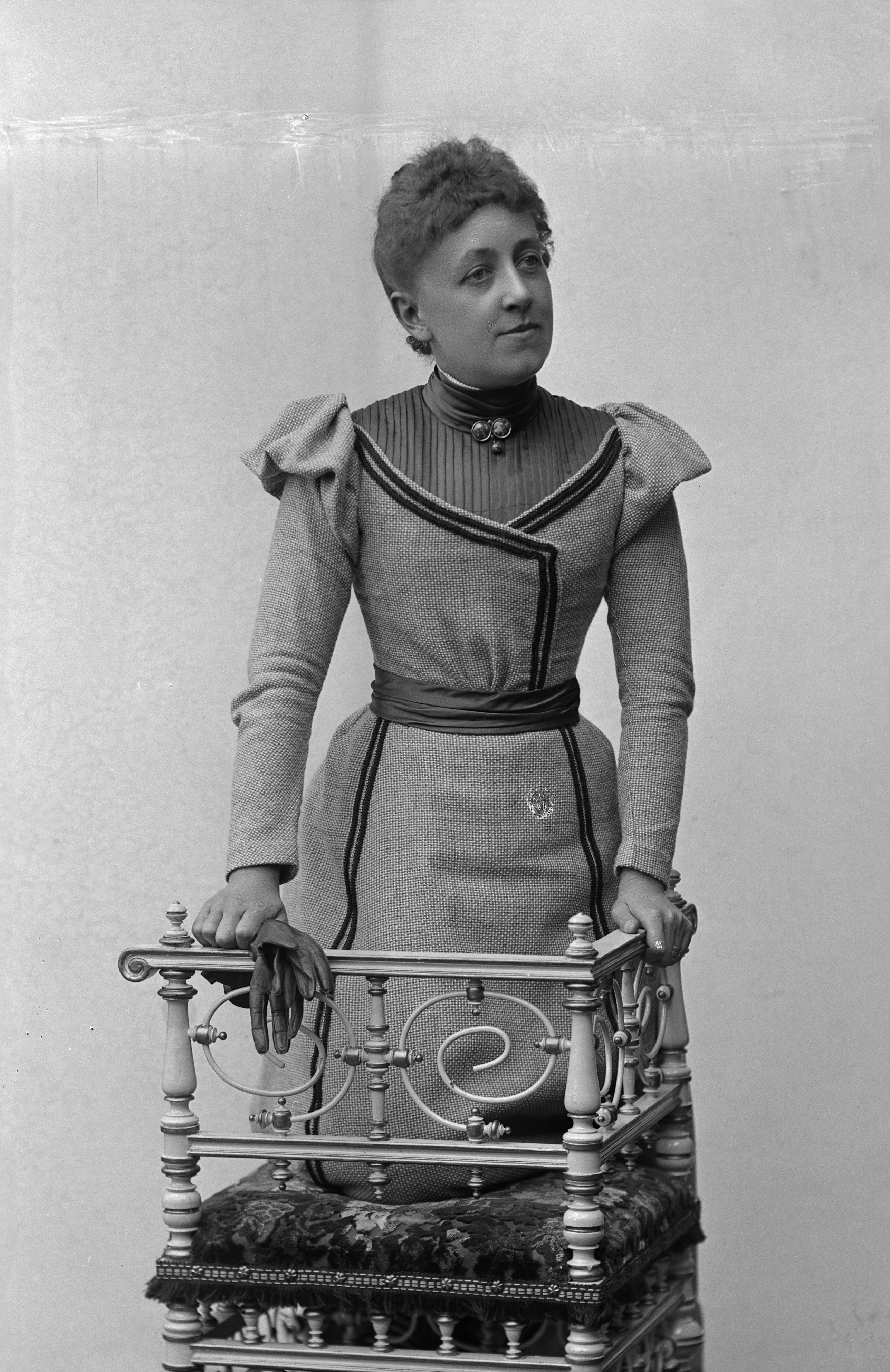 Porträtt i helfigur av fru Hammar, stående vid stol.