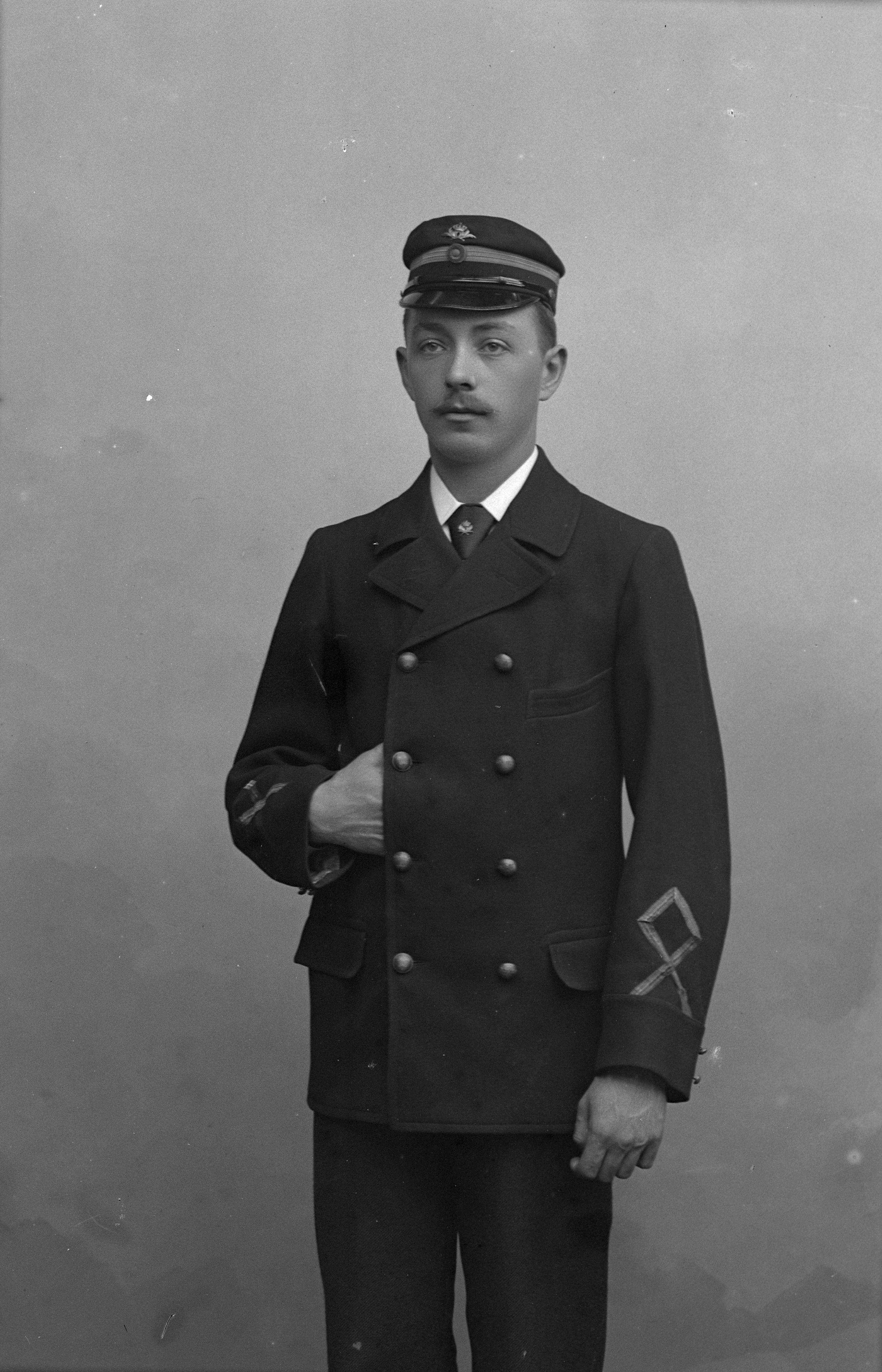 Porträtt i helfigur av herr Holmstedt, postanställd, iklädd yrkesuniform.