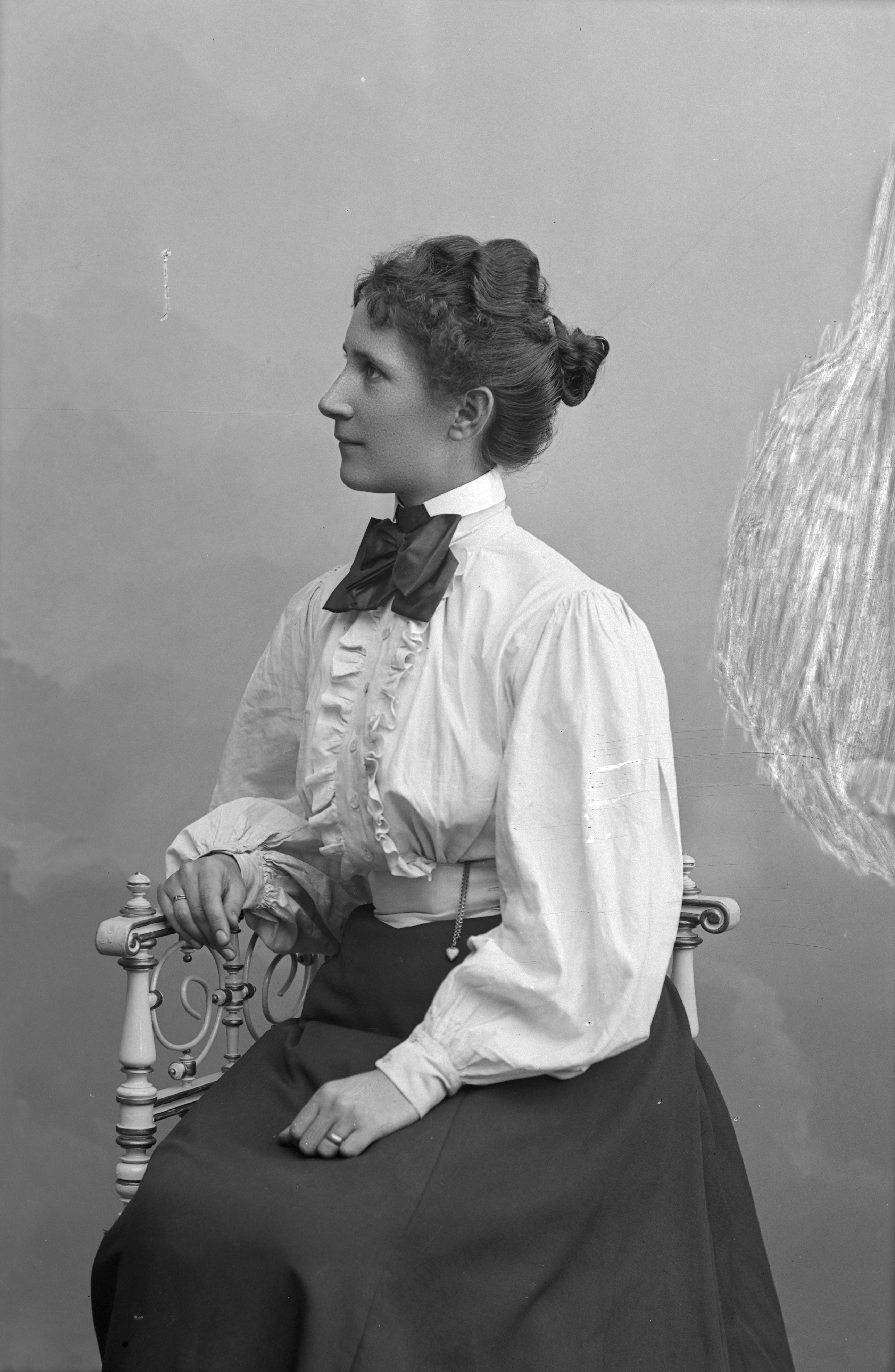 Porträtt i helfigur av sömmerskan Anna Fridolf, ansikte i profil, sittande i stol.