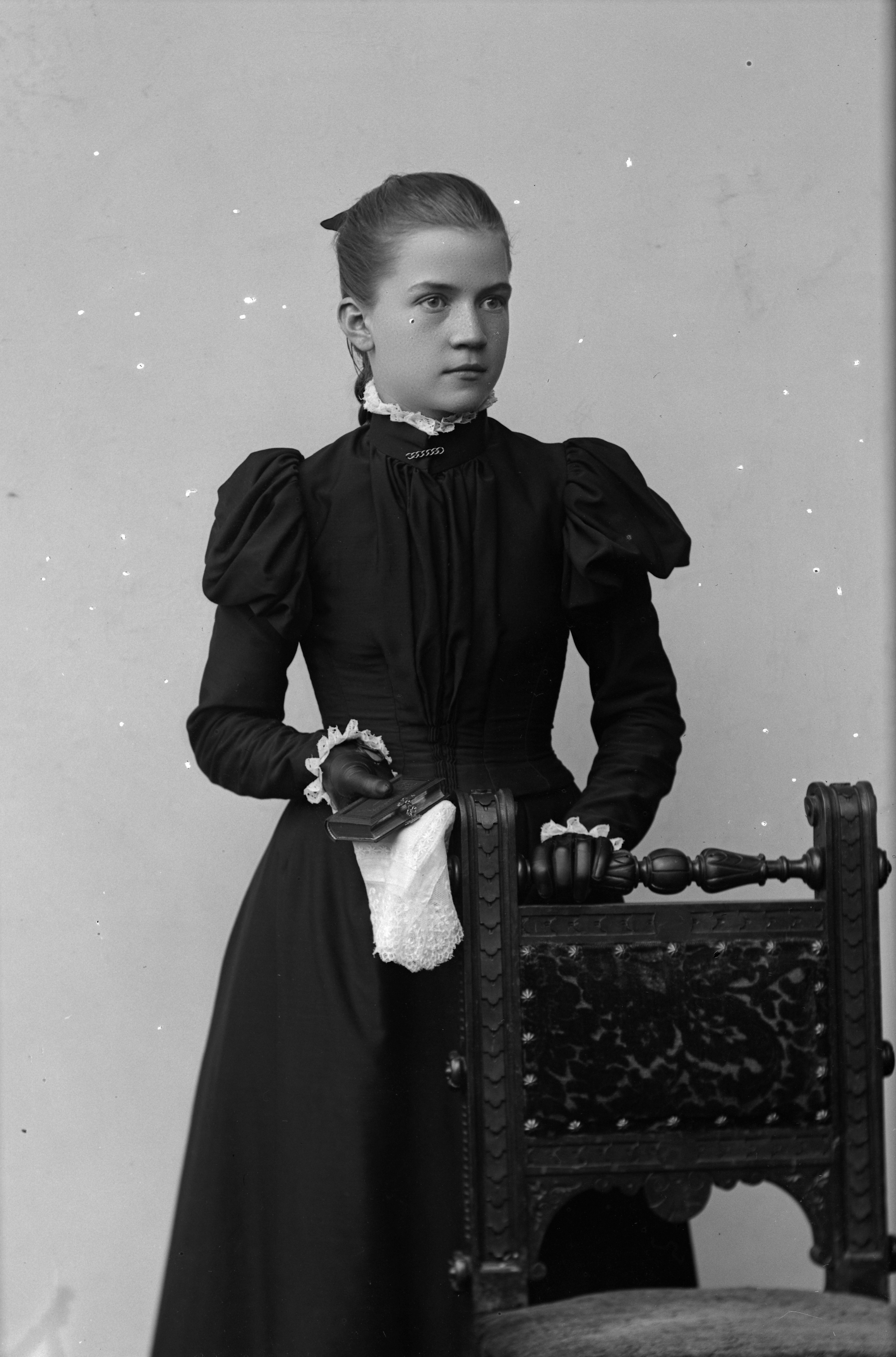 Porträtt i helfigur av Augusta Andersson, stående vid stol, hållande bönebok och portmonnä.