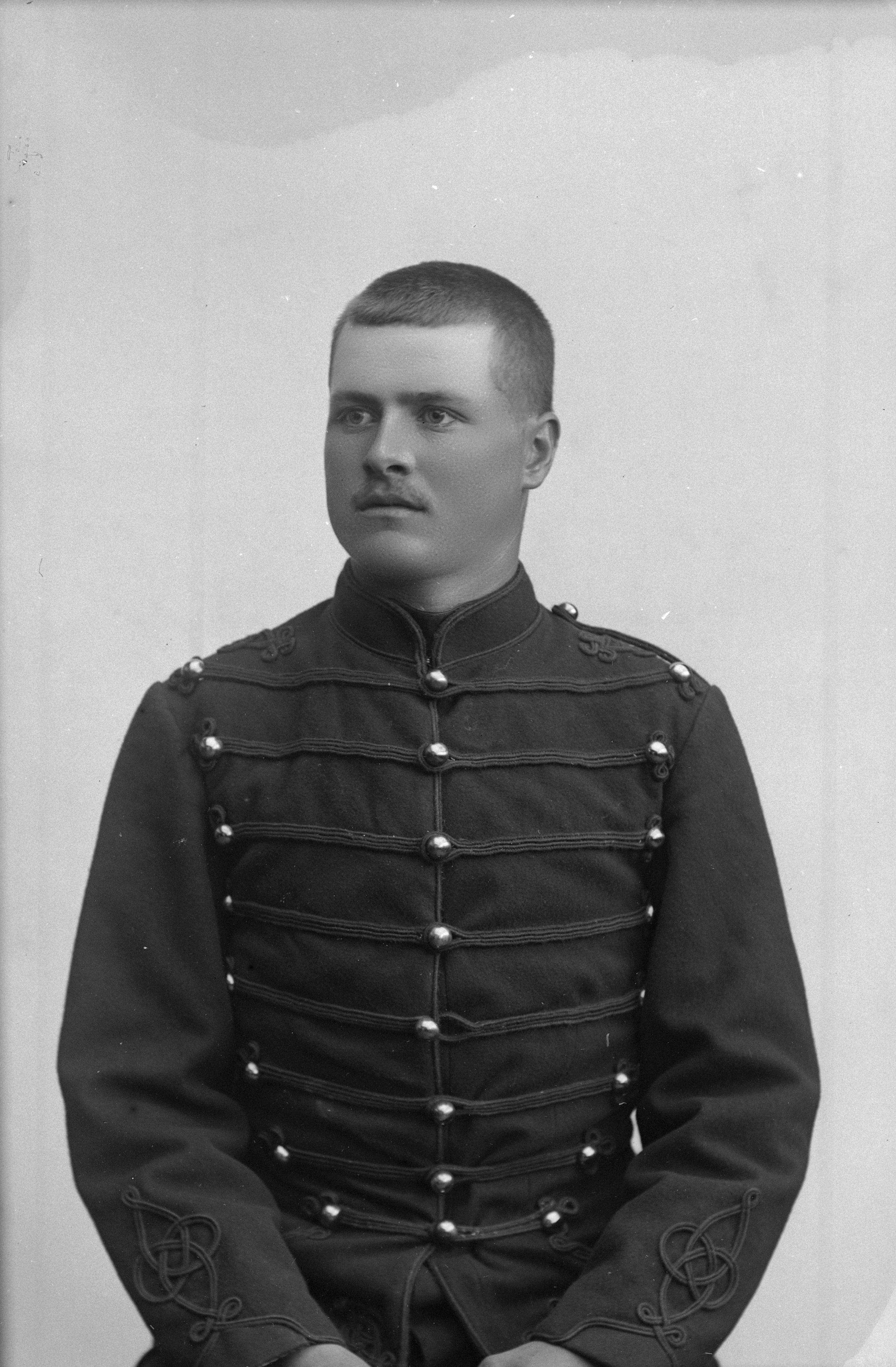 Porträtt i halvfigur av husar Palmquist, iklädd militäruniform.