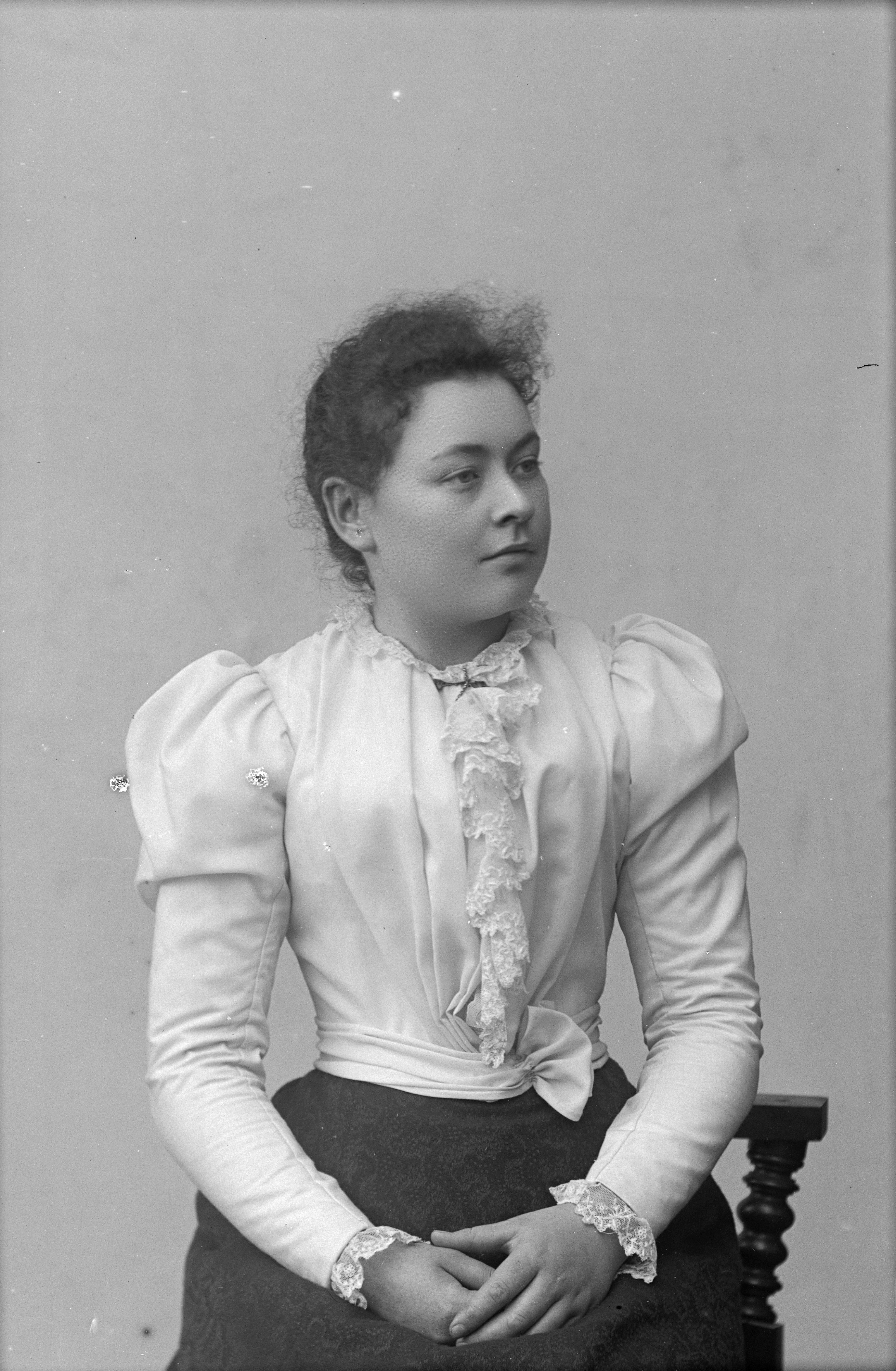 Beskrivning: Porträtt i halvfigur av mejeriarbeterskan Hilda Persson.