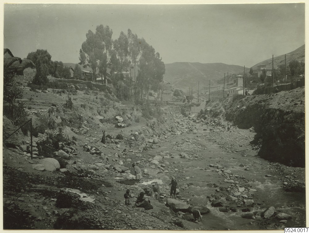 En bit av Rio de La Paz, där den rinner genom den bolivianska huvudstaden. Cholas sitta nere vid floden och tvätta sina kläder. Det redan färdigtvättade har bretts ut på stranden, där man längre bort ser två av deras snabbt nersmutsade kjolar utlagda, på avstånd liknande väldiga kvarnstenar.