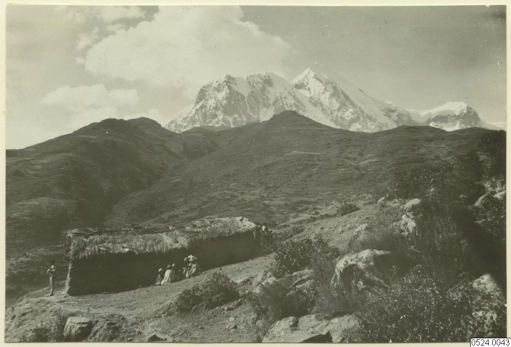 Aymara-ursprungsfolk utanför sin hydda, ej långt från Illimanis snöiga toppar.