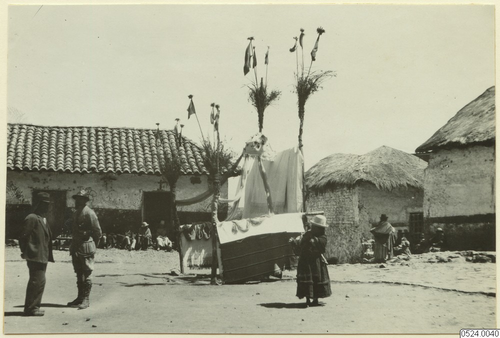 Plazan i Cohoni i festskrud. Mitt på bilden ett festligt smyckat "altare", till vänster "corregidoren" och Kozlowski. By, (3,800 m.)