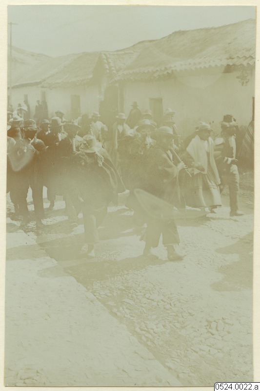 Människor gående och spelande på instrument på en väg bredvid byggnader.