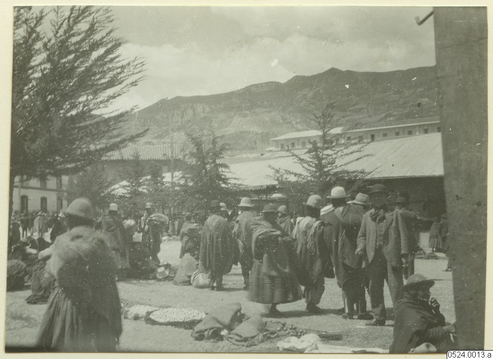 Beskrivning: Från saluplatsen framför Iglesia de San Francisko. I förgrunden skor, som sälja "chunos", potatis, ordnade i högar på fem stycken i varje hög. Borta i hörnet synas män samlade kring ett stånd där framförallt tuggat majsöl försäljes, " lgl de S.F. är den speciella kyrkan.