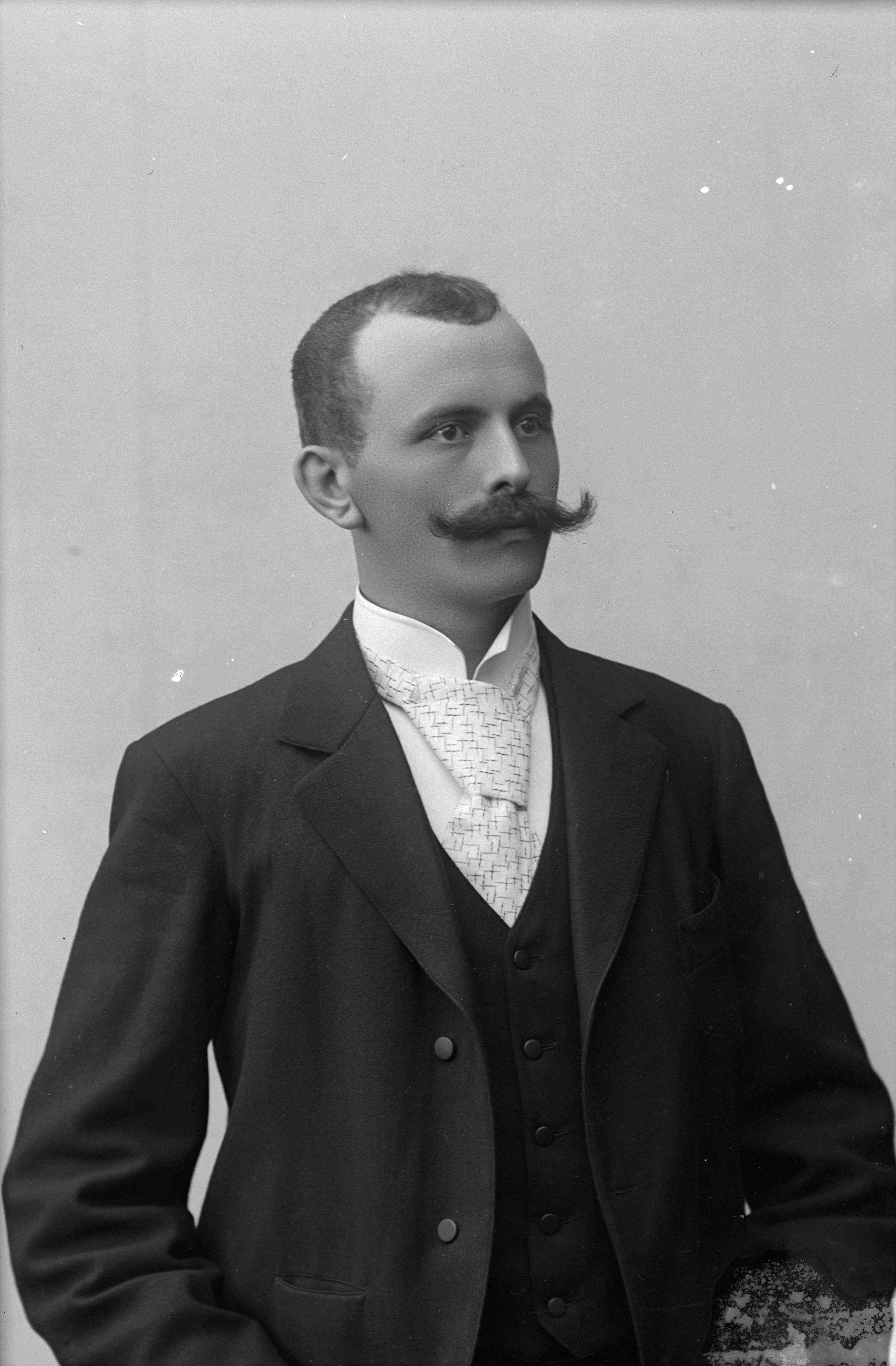 Beskrivning: Porträtt i halvfigur av mejeriarbetare P. Andersson.