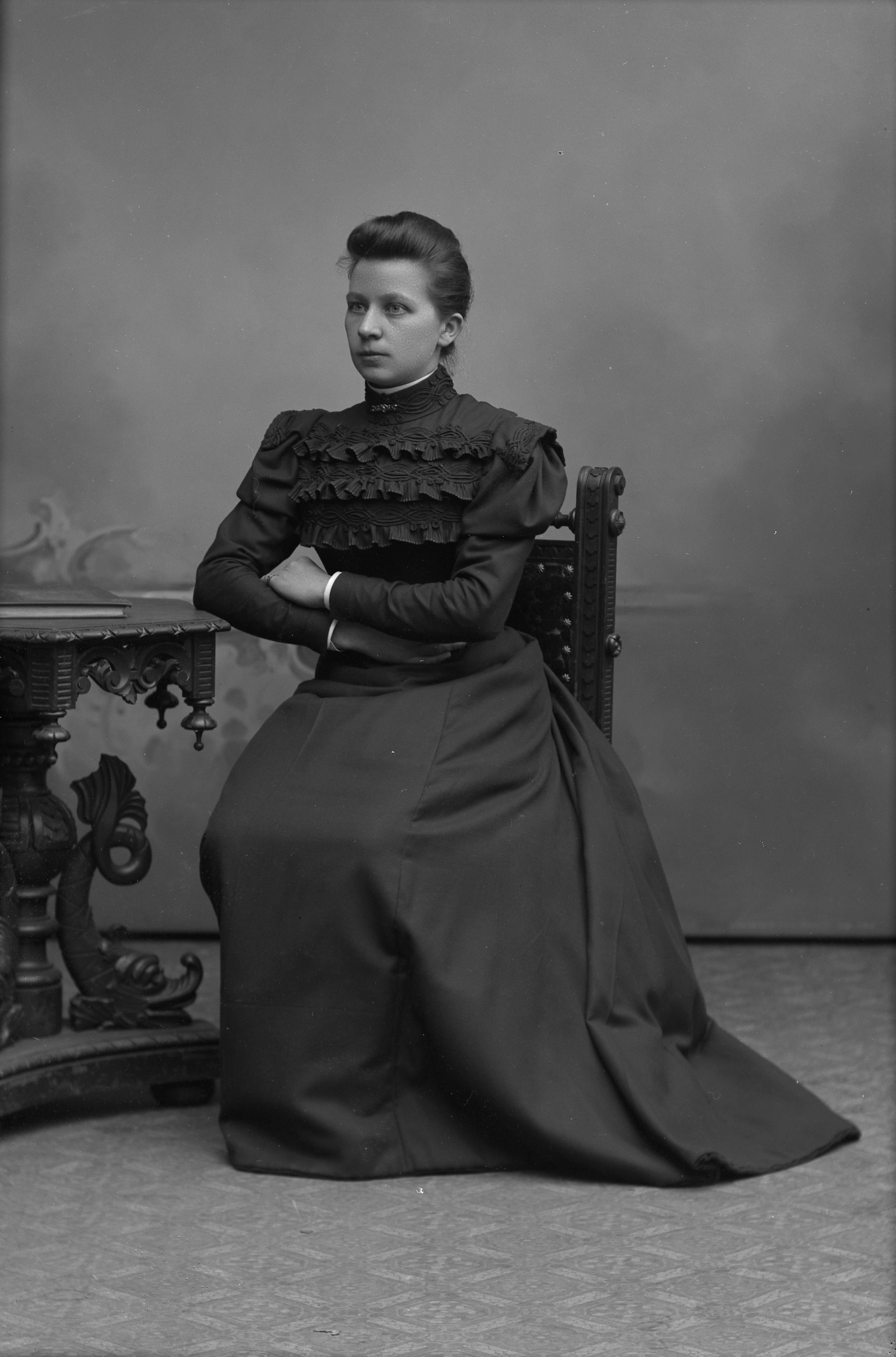Porträtt i helfigur av Maria Olsson, sittande på stol, vid pelarbord.