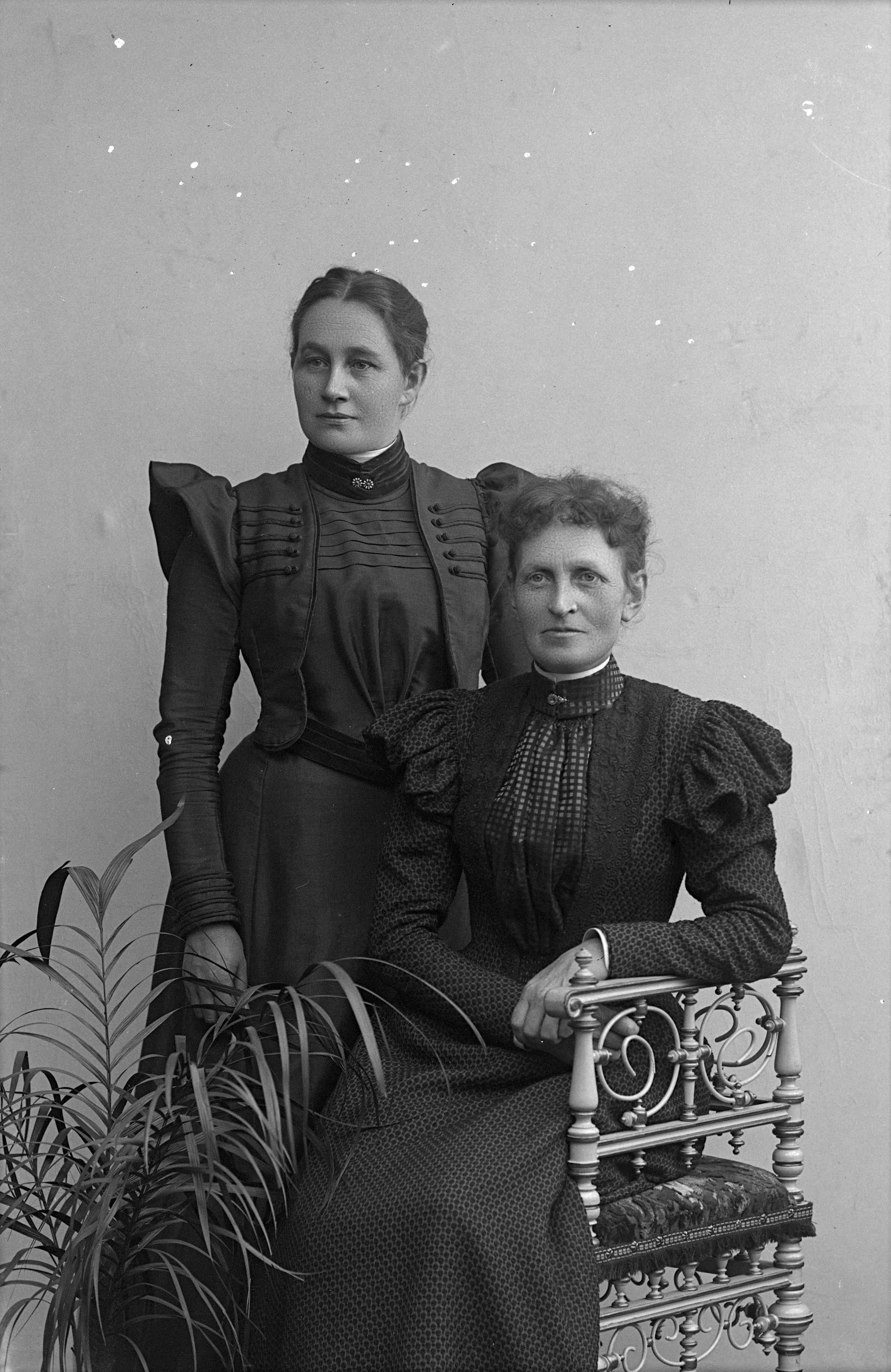 Porträtt i helfigur av Elsa Bengtsson med okänd kvinna. En av kvinnorna sittande. Växt i förgrunden, stående på golvet.